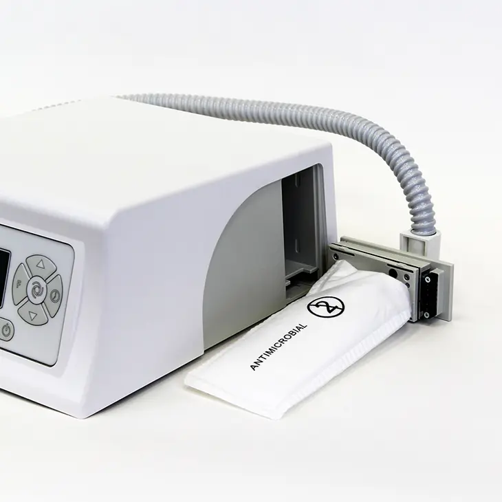 Корпус аппарата для педикюра с пылесосом изготовлен из прочного металла и окрашен в белый цвет. Подставка для ручки выполнена из ударопрочного пластика. Мешок из специального нетканого полотна способен пропускать воздух, но при этом эффективно удерживает содержимое.