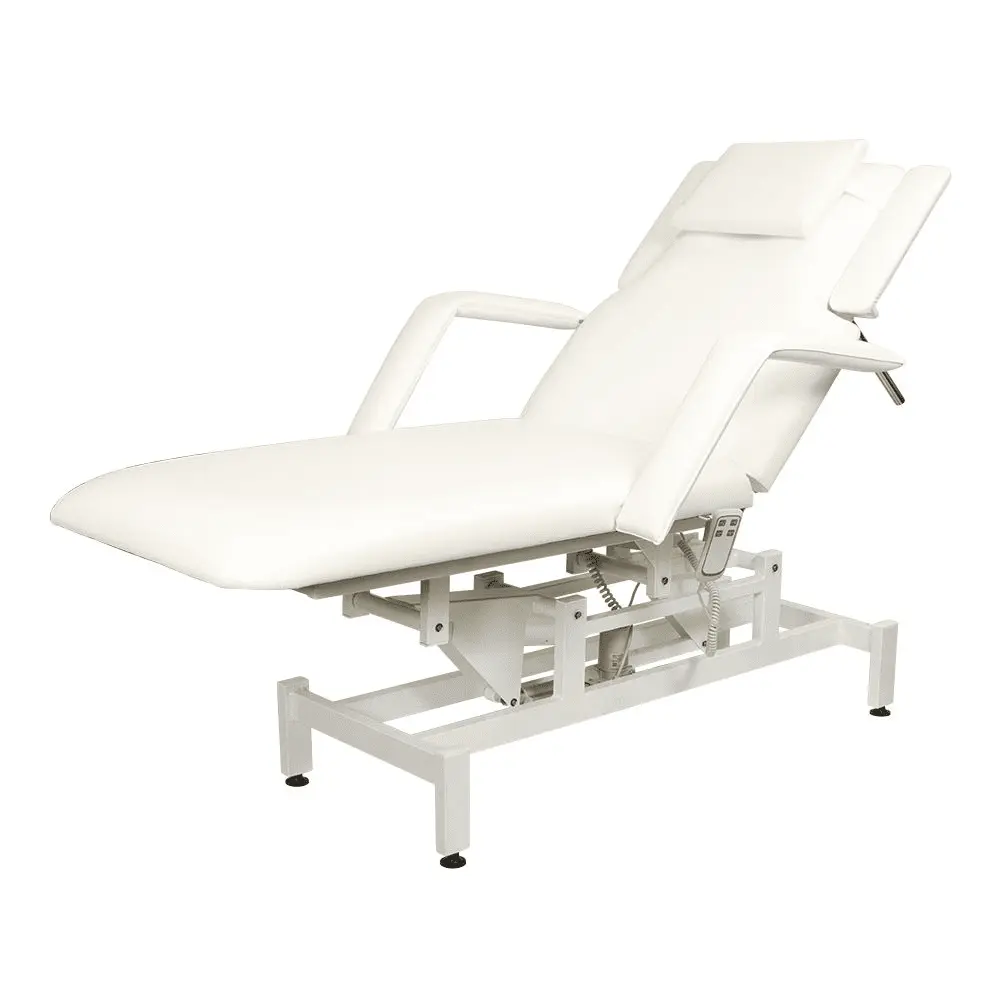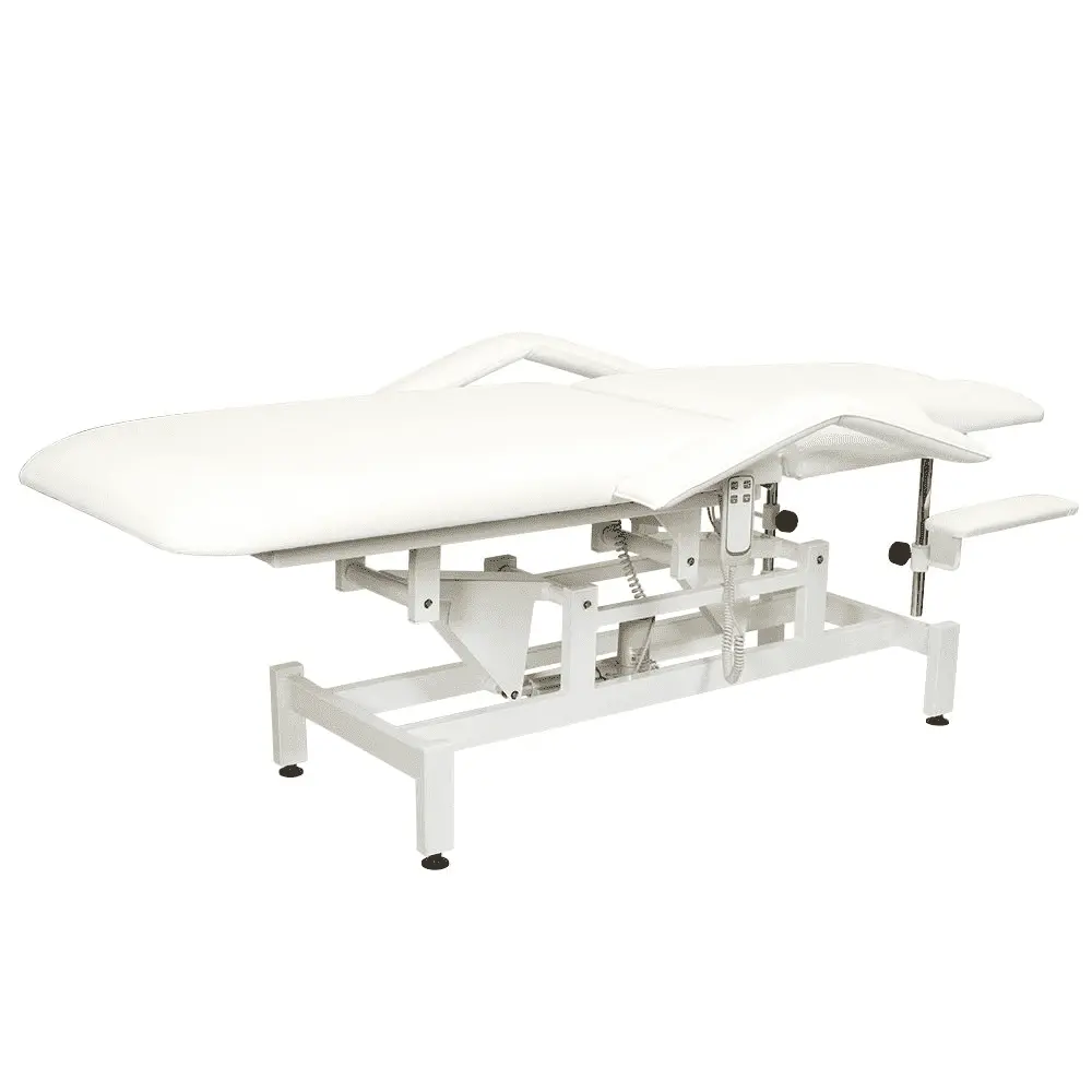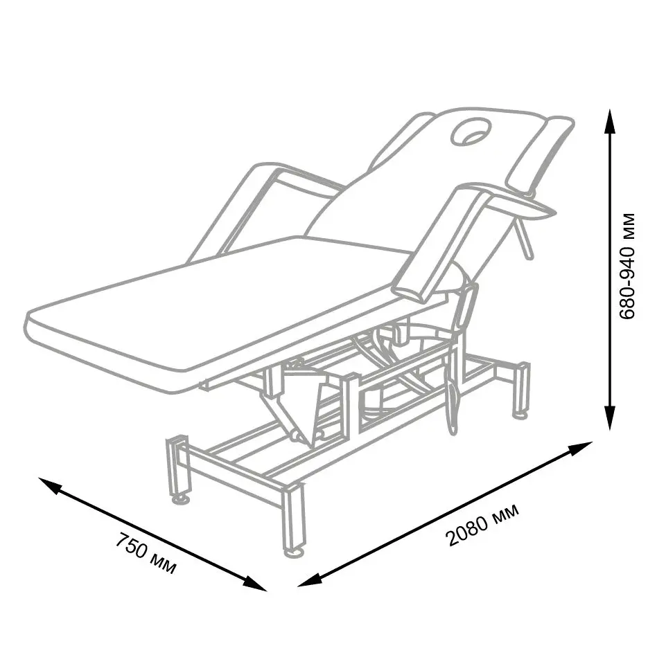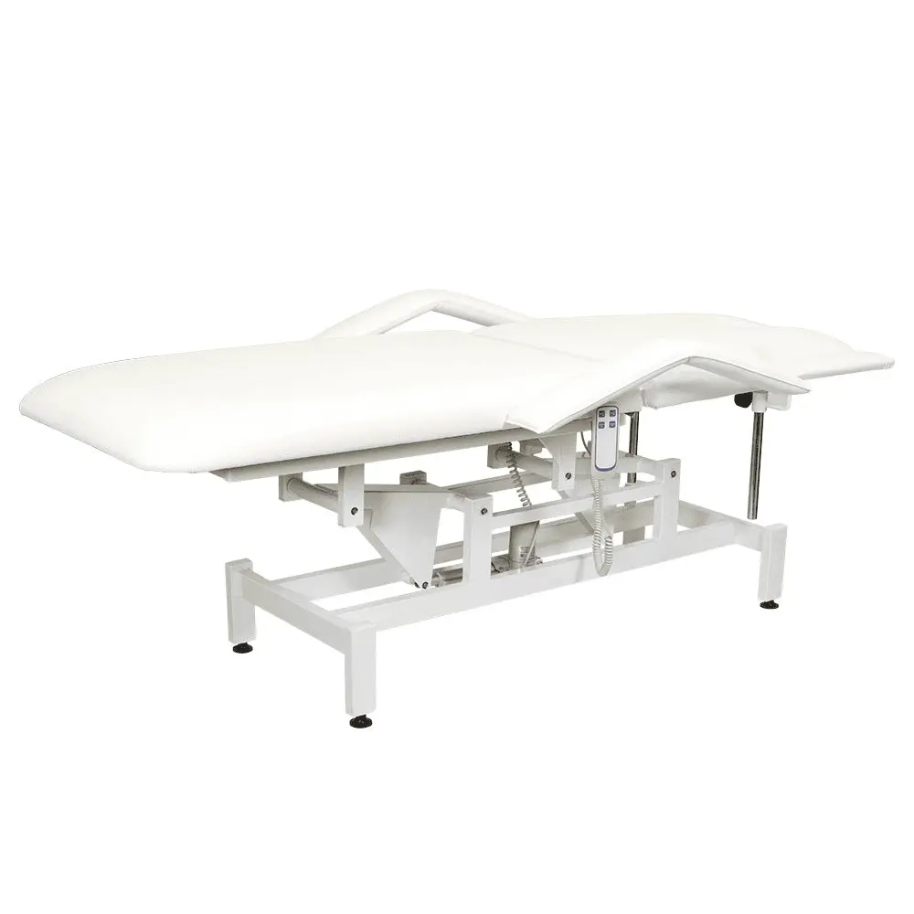 Кушетка разделена на два мягких сегмента, положение которых регулируется. С помощью двух встроенных электромоторов можно дистанционно регулировать угол наклона спинки и высоту кушетки. В комплект поставки входит удобный пульт управления электроприводом. Каркас и основание из металла с защитным покрытием.