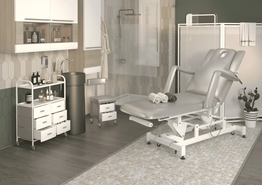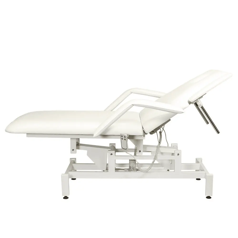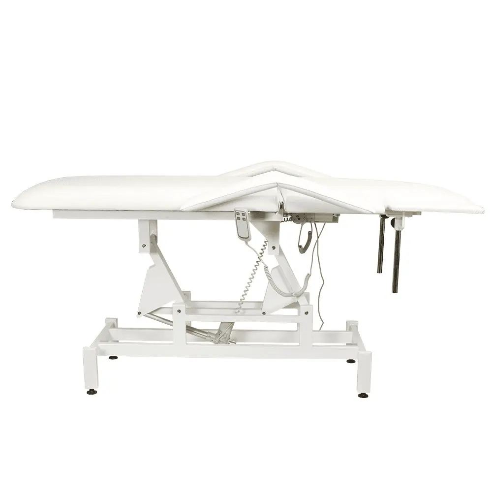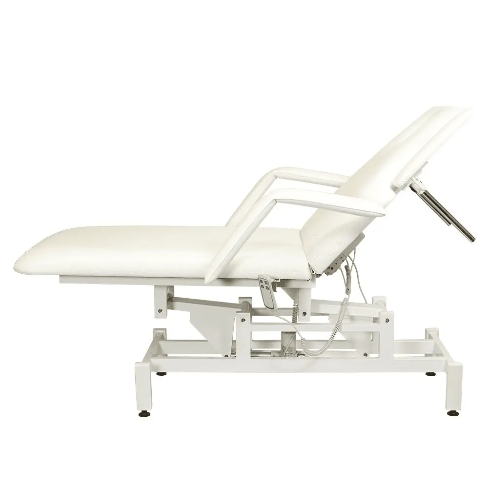 Кушетка разделена на два мягких сегмента, положение которых регулируется. С помощью двух встроенных электромоторов можно дистанционно регулировать угол наклона спинки и высоту кушетки. В комплект поставки входит удобный пульт управления электроприводом. Каркас и основание из металла с защитным покрытием.