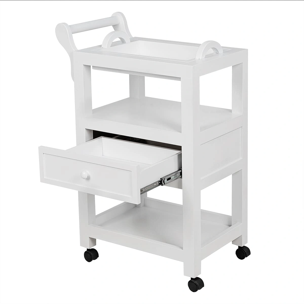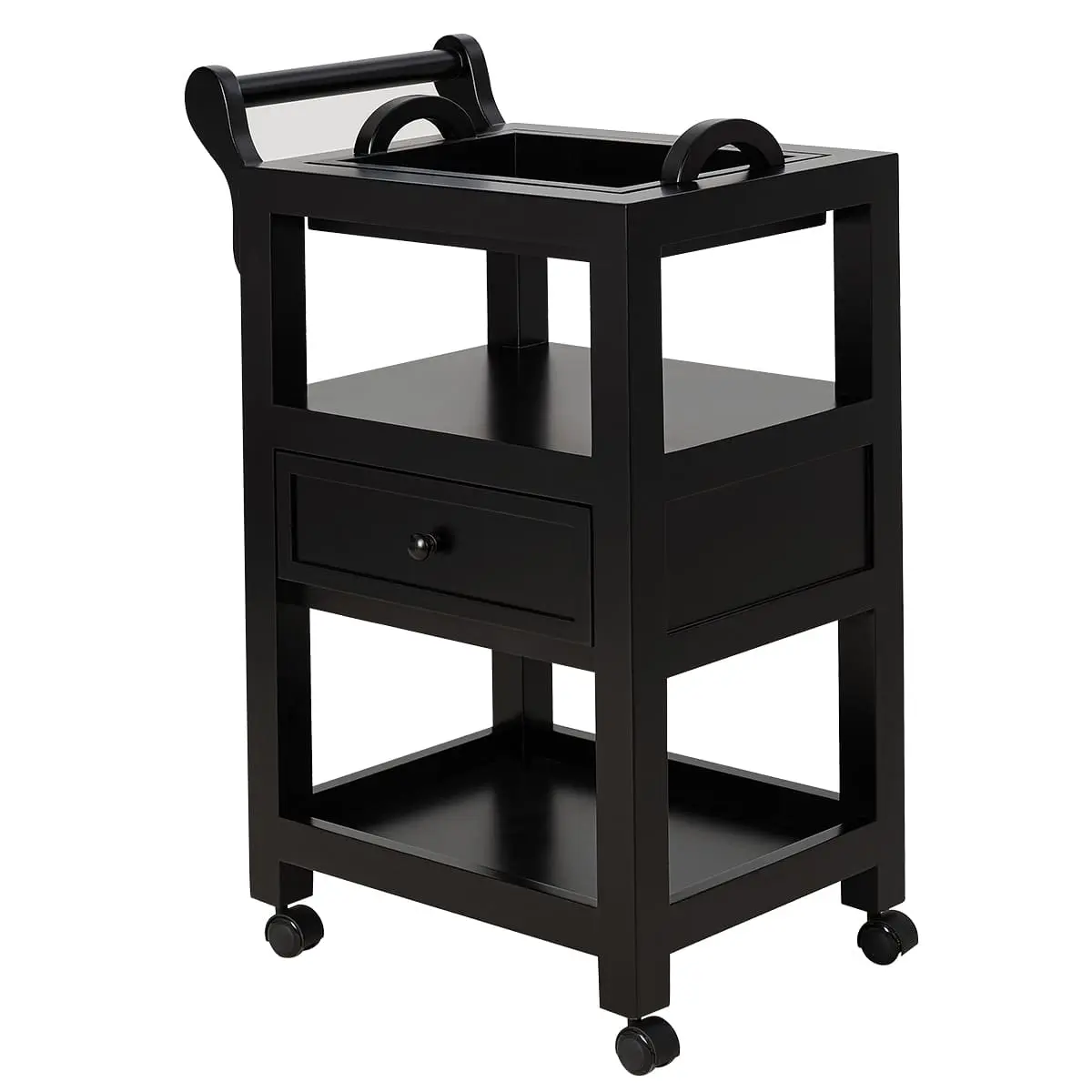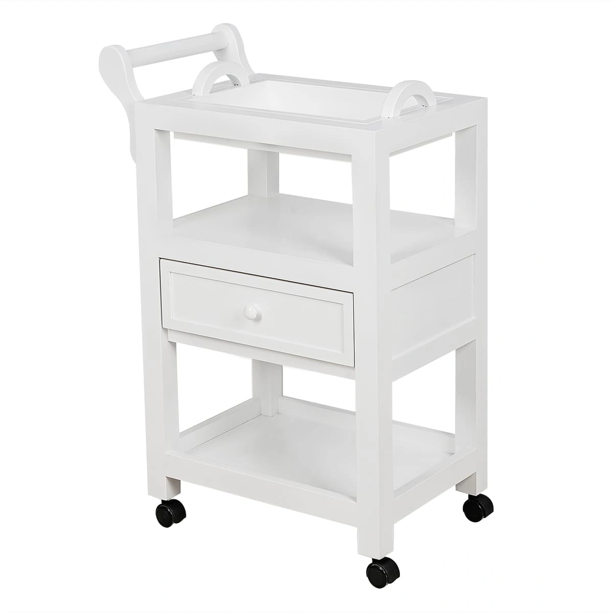 Верхняя полка оснащена съемным столиком с ручками, где можно хранить чаши и емкости, и при необходимости легко снять и почистить столик. Также на верхней полке находится отдельная удобная ручка, на которой можно разместить аксессуары, и с помощью которой можно легко переместить столик. Это делает его настоящей находкой для мастеров СПА-салонов. Его конструкция и функциональность словно созданы для проведения СПА-процедур. А посетители оценят стильный внешний вид.