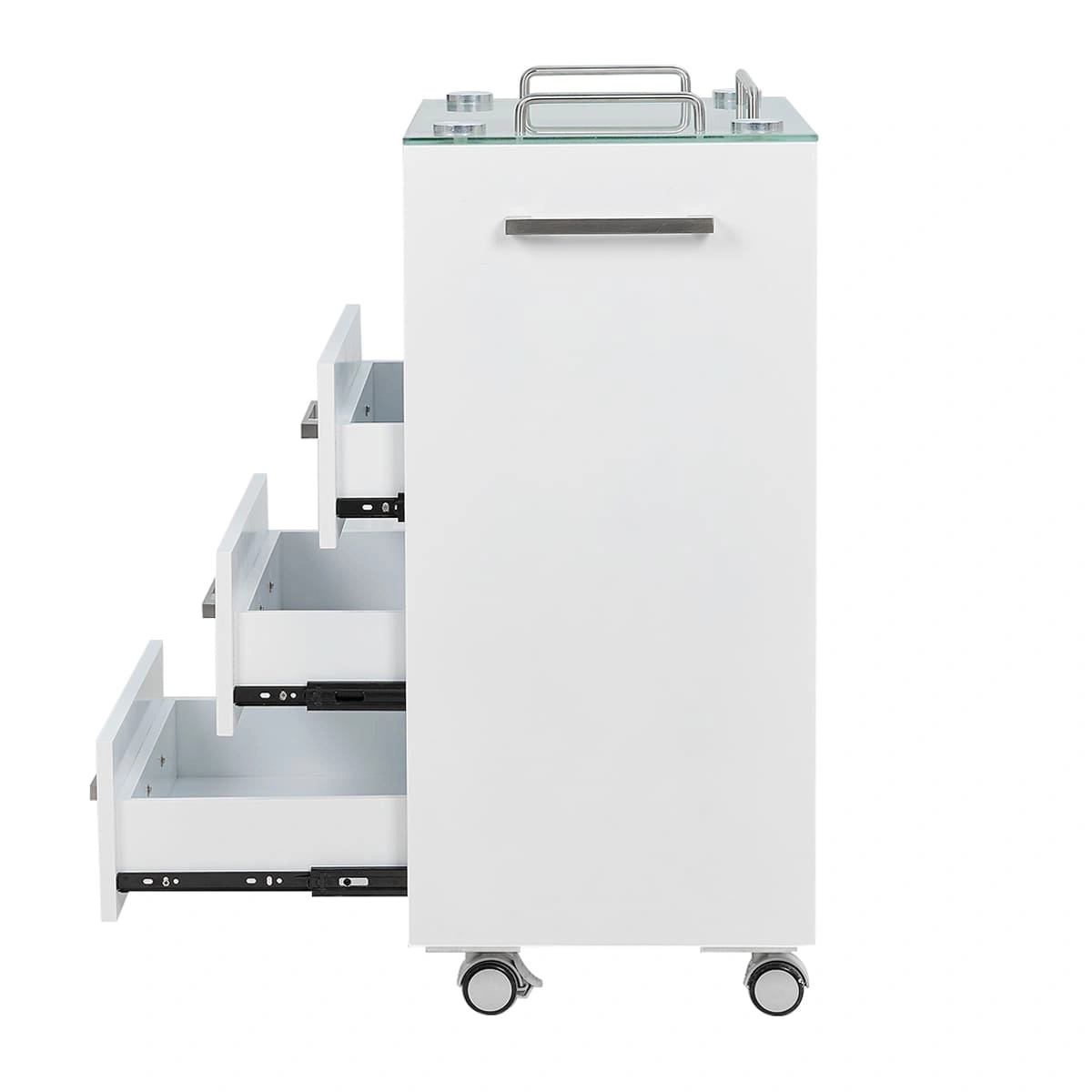 Конструкция столика отличается своей простотой и функциональностью. Вместительная тумба с тремя выдвижными ящиками, где можно хранить все необходимые расходные материалы. В открытой полке мастер может разложить принадлежности, которые часто использует при косметологических или СПА-процедурах. А на стеклянной полке сверху удобно размещать инструменты и средства, которые используются в данный момент. Хромированные бортики служат надежным барьером от случайного падения инструментов на пол. Ручки по бокам тумбы позволяют не только легко перемещать столик, но и разместить на них аксессуары.