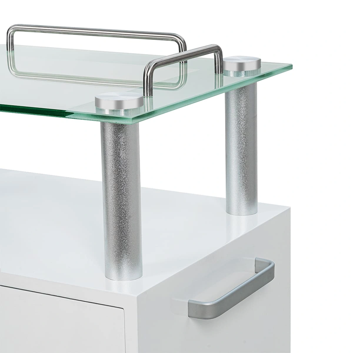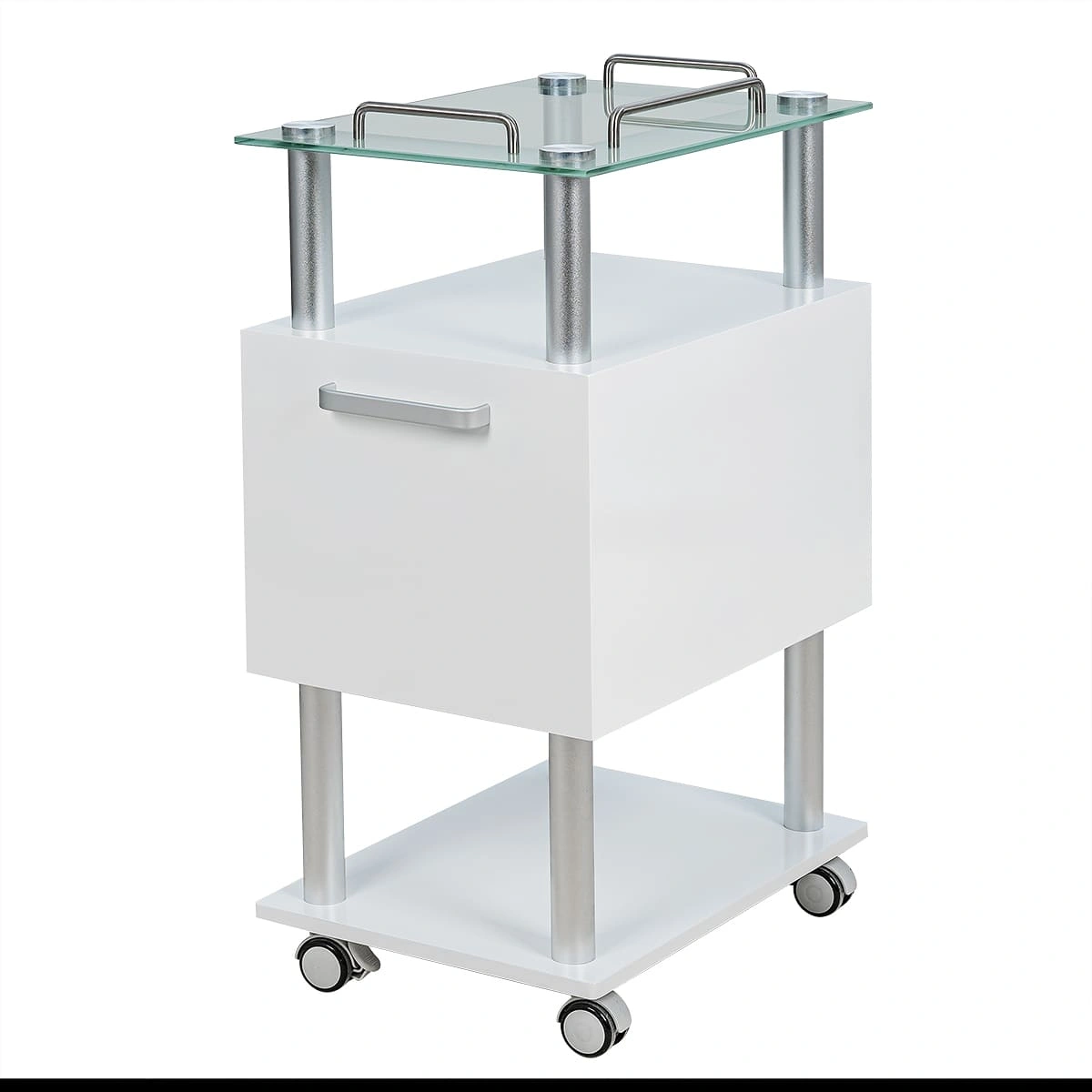 Тумбочка состоит из каркаса в виде хромированных труб, внизу и вверху расположены две открытые полки, на которых мастер может удобно разместить инструменты и принадлежности, исходя из своих предпочтений и проводимой процедуры. Для расходных материалов и аксессуаров между полками находятся два закрытых вместительных ящика. Сверху столика размещена стеклянная полка с хромированными бортиками, которые защищают хранящиеся на столике предметы от падения.