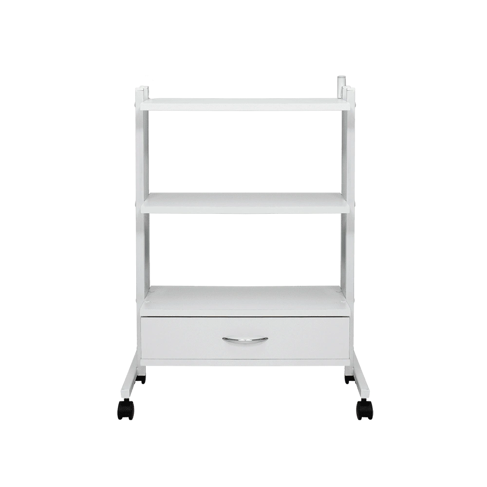 Для размещения инструментов, приборов, косметологических препаратов и прочих принадлежностей предусмотрено три удобных полки и закрытый выдвижной ящик. Полочки и ящик выполнены из качественной ЛДСП с ровной поверхностью. Боковые стойки каркаса оснащены одним держателем для размещения лампы-лупы на струбцине. Тележка косметологическая Трио от магазина МЭДИСОН выполнена в классическом стиле, благодаря чему она отлично сочетается с любым оборудованием.