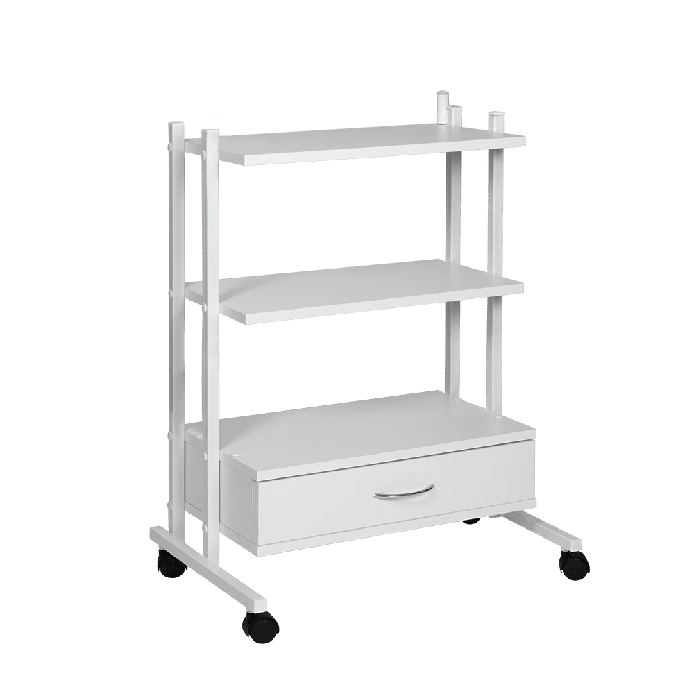 Комплектация: металлический каркас, три полки, выдвижной ящик, колеса.