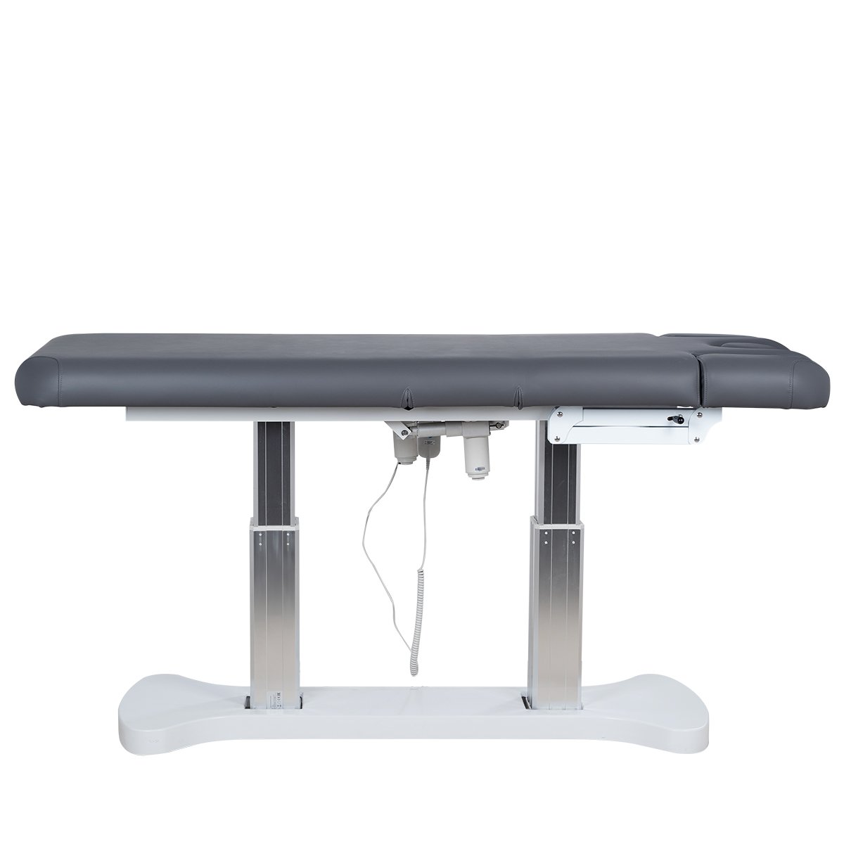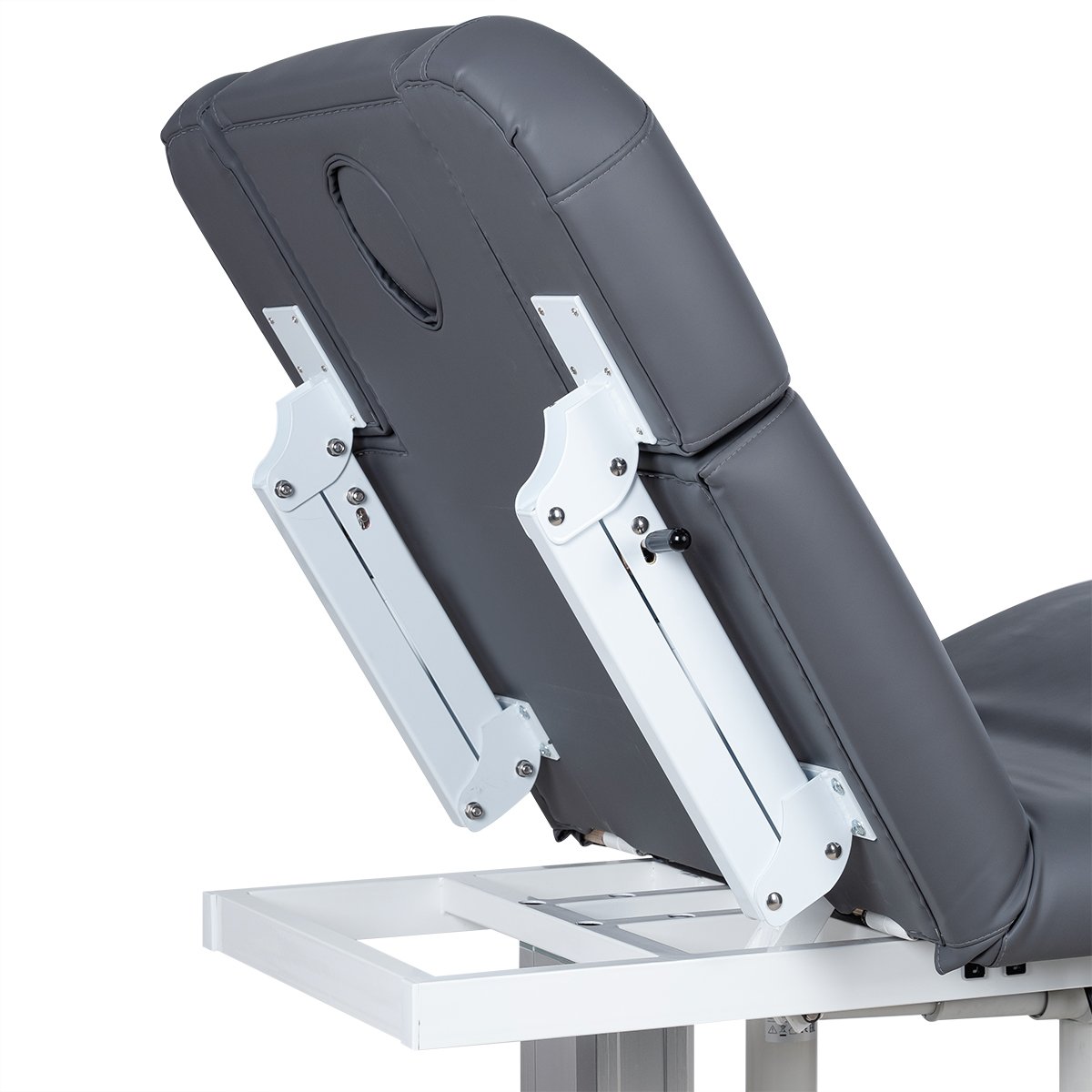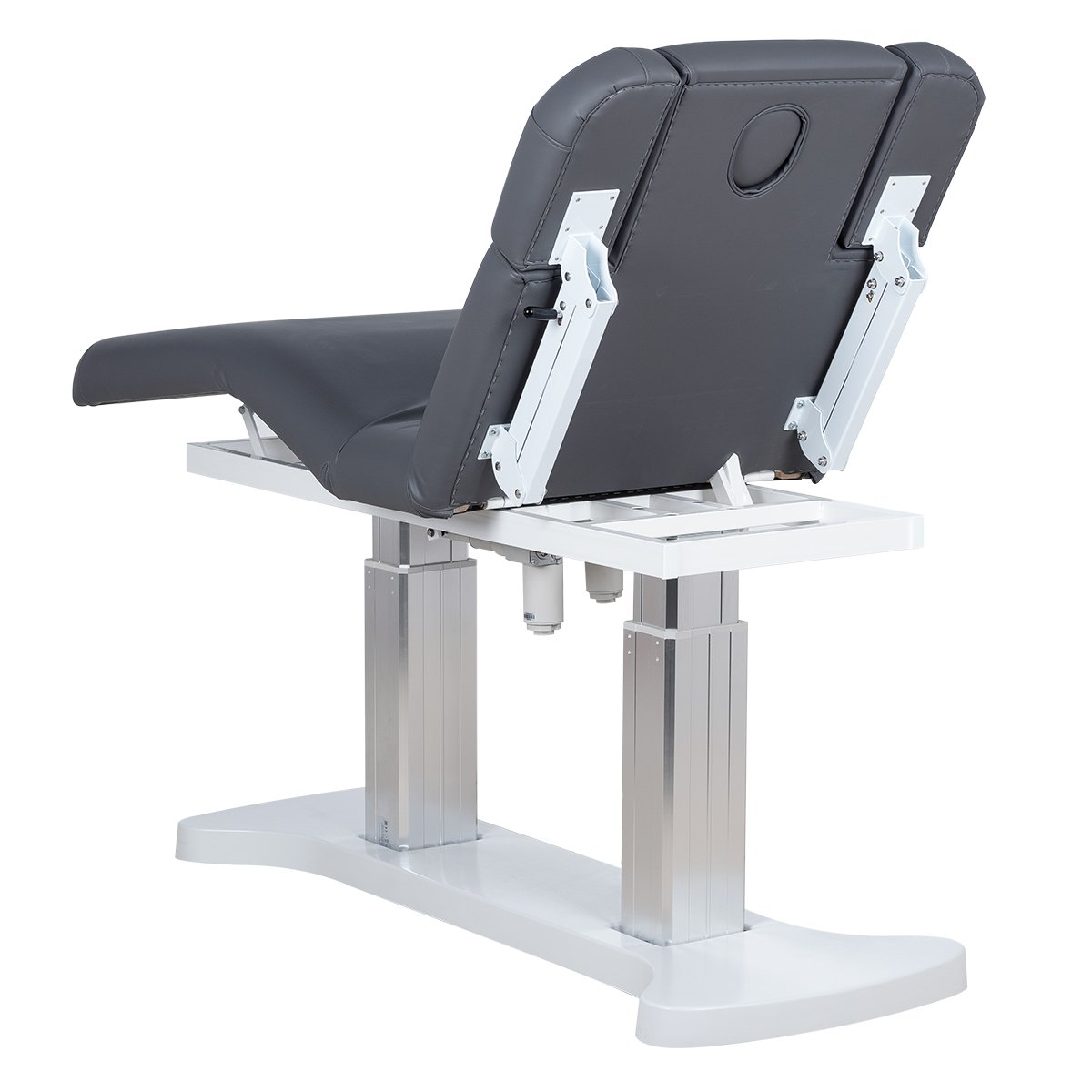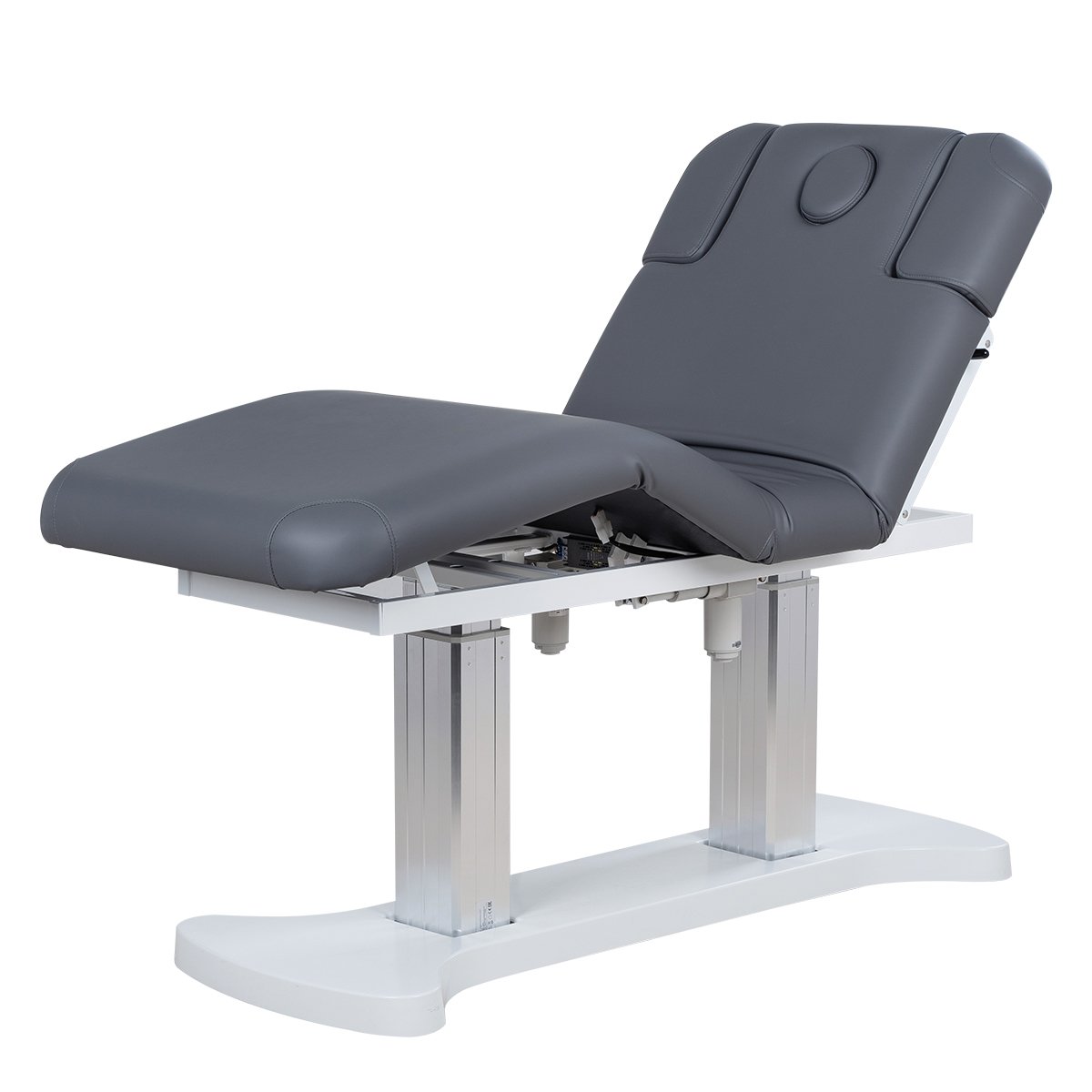 В спинке СПА-кушетки есть специальный вырез для лица, который при необходимости можно закрыть подушкой. Подлокотники регулируются по высоте и адаптируются под клиента — обеспечивая удобство в положении лёжа на животе. Благодаря единому ложу без разделения на секции, кушетка подходит абсолютно для всех процедур сразу в трёх направлениях: косметология, спа и массаж. Комплектуется ручным или ножным пультом — на выбор!