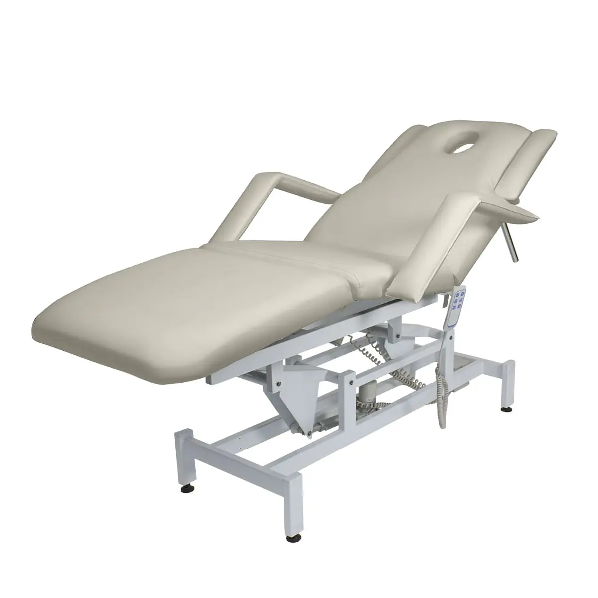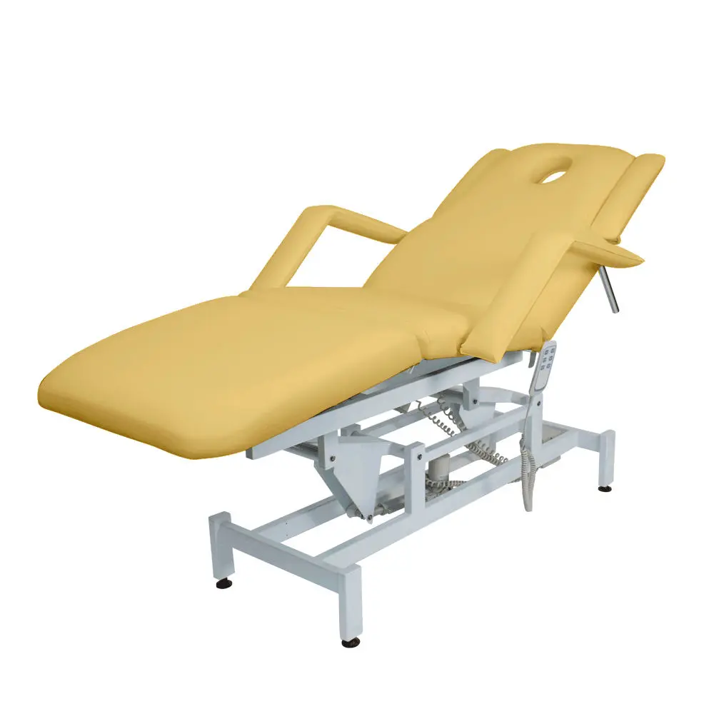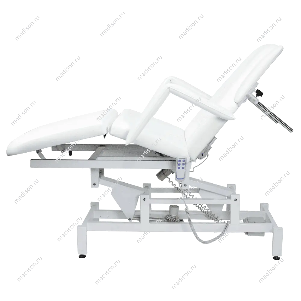 Кушетка массажная МД-849 (Элегия-3А) (электропривод, 3 мотора) – это профессиональное оборудование от компании МЭДИСОН. Она разработана для применения в массажном или косметологическом кабинете высокого уровня. Мягкая часть кушетки разделена на три сегмента: сиденье, спинка, элемент для ног. Это значительно повышает комфорт при использовании и обеспечивает необходимую функциональность во время работы. В спинке есть специальный вырез для лица. Для удобного расположения рук по время массажа предусмотрены навесные подлокотники, регулируемые по высоте.