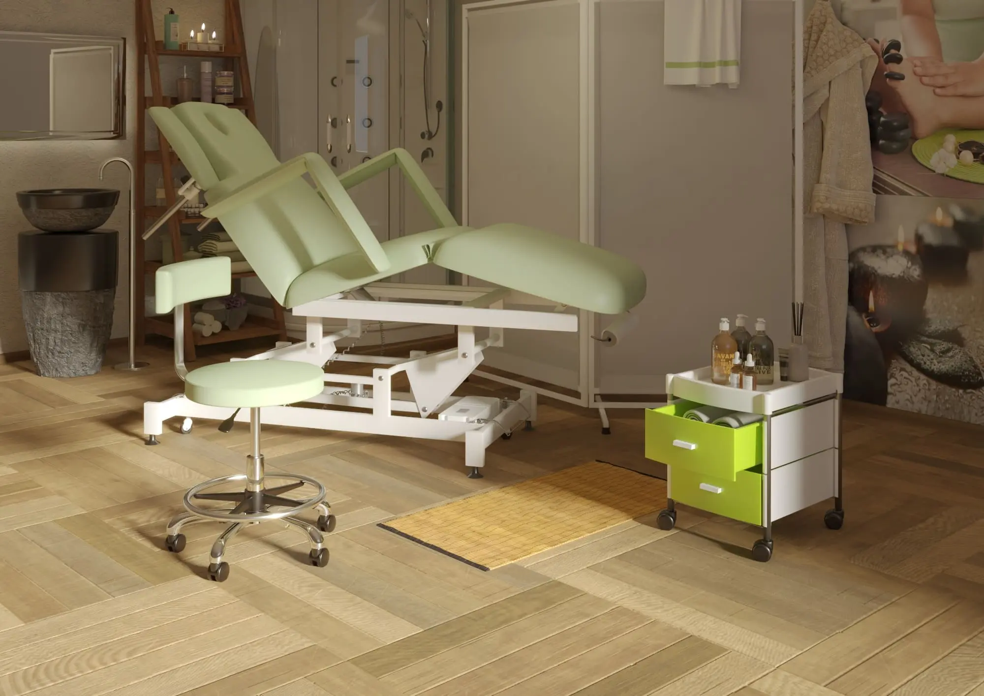 Вы можете заказать кушетку на подпятниках (стандартная комплектация) или на колесной базе.