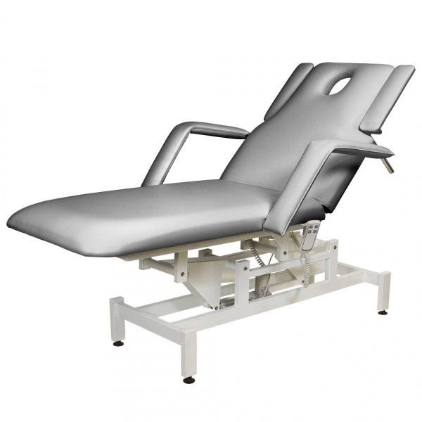 Кушетка разделена на два мягких сегмента, положение которых регулируется. С помощью двух встроенных электромоторов можно дистанционно регулировать угол наклона спинки и высоту кушетки. В комплект поставки входит удобный пульт управления электроприводом. Каркас и основание из металла с защитным покрытием.