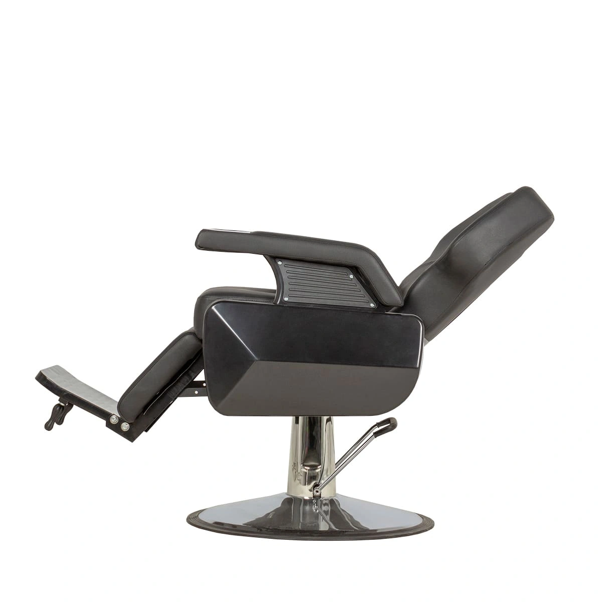 В основании оборудования хромированный стальной диск с резиновым кантом, что обеспечивает защиту напольного покрытия. Каркас изготовлен из металла и многослойной фанеры. Благодаря тяжелой основе и стальному каркасу, кресло устойчиво в любом положении. Хромированные элементы также устойчивы к воздействию влаги и косметических средств. Подлокотники выполнены из ударопрочного пластика. В качестве обивки использована износостойкая экокожа. Материал не подвергается царапинам, не впитывает загрязнения и долго сохраняет красивый внешний вид.