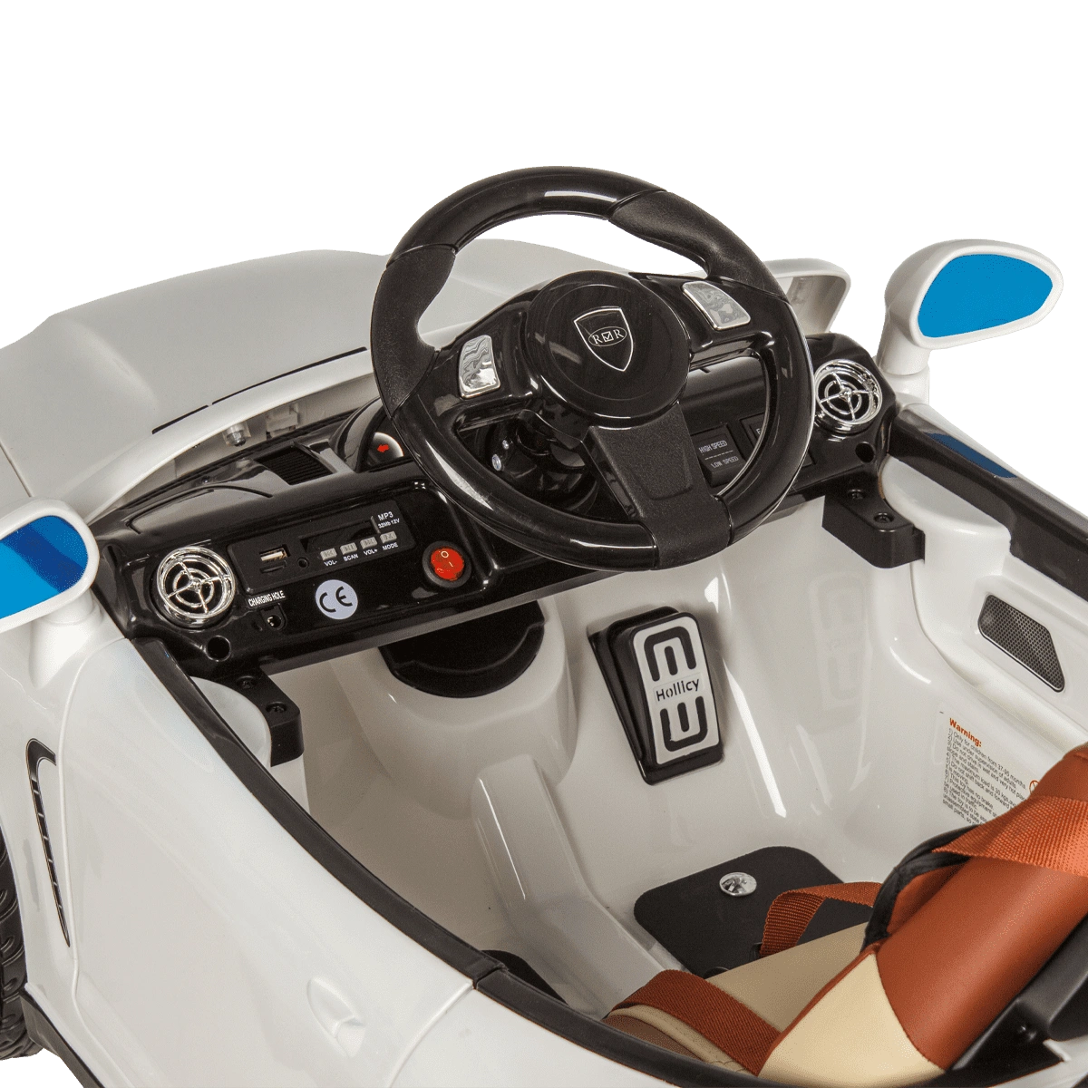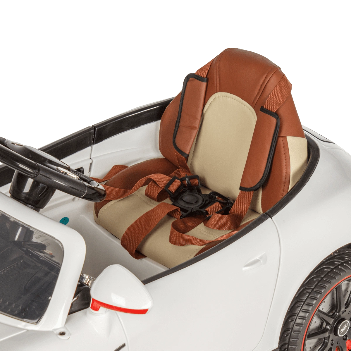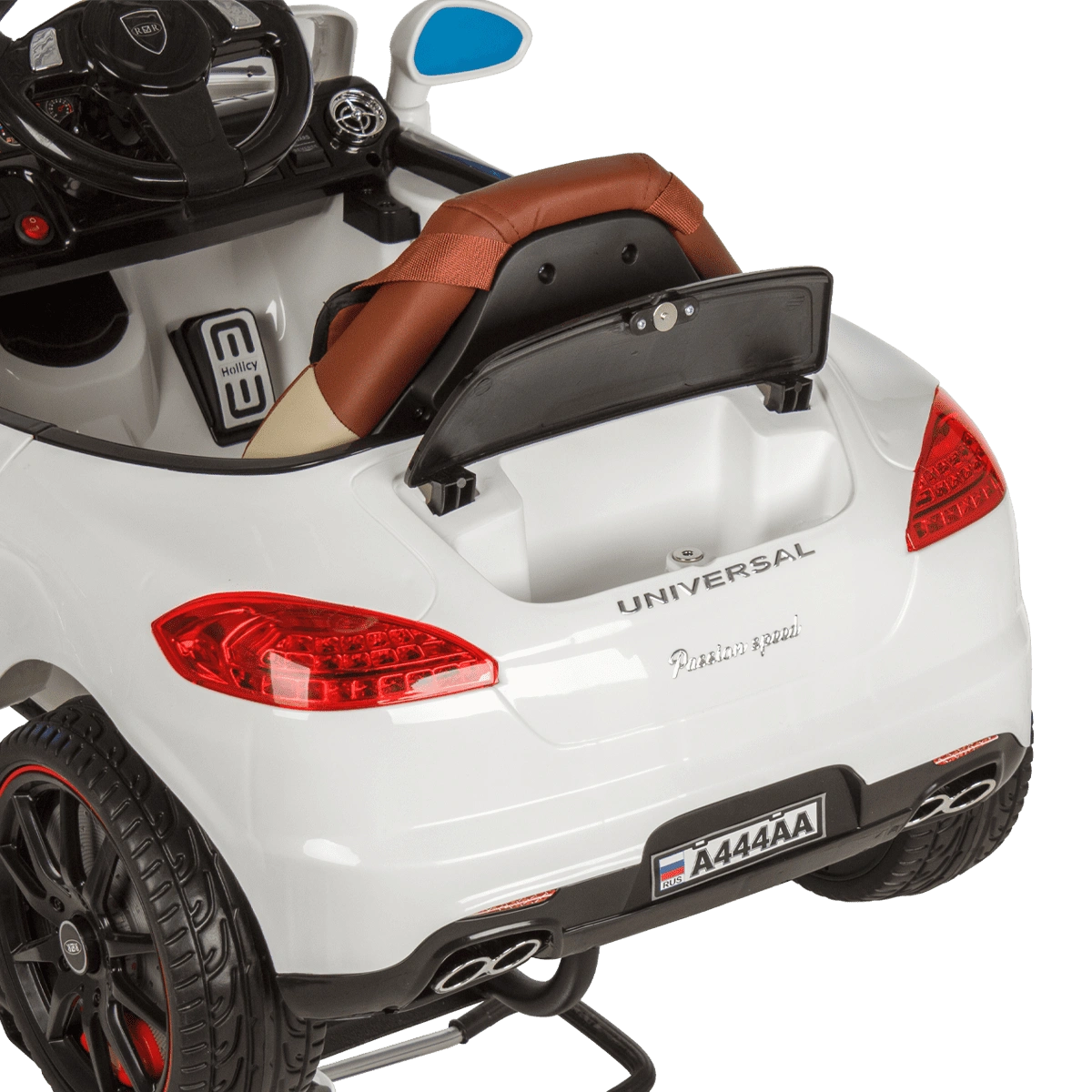 Машинка: белый корпус, колеса, передние и задние фары, сиденье, руль, колонки, кабель для зарядки аккумулятора.
