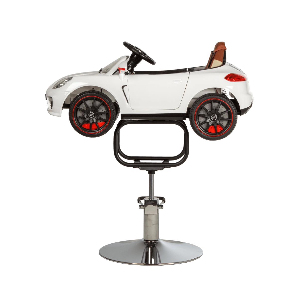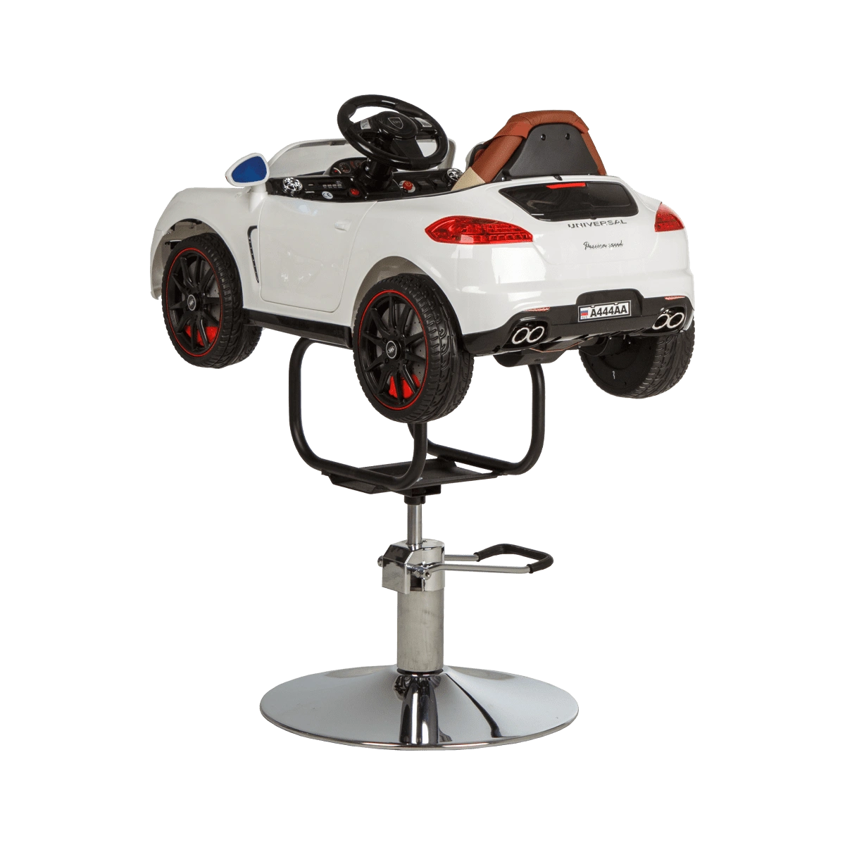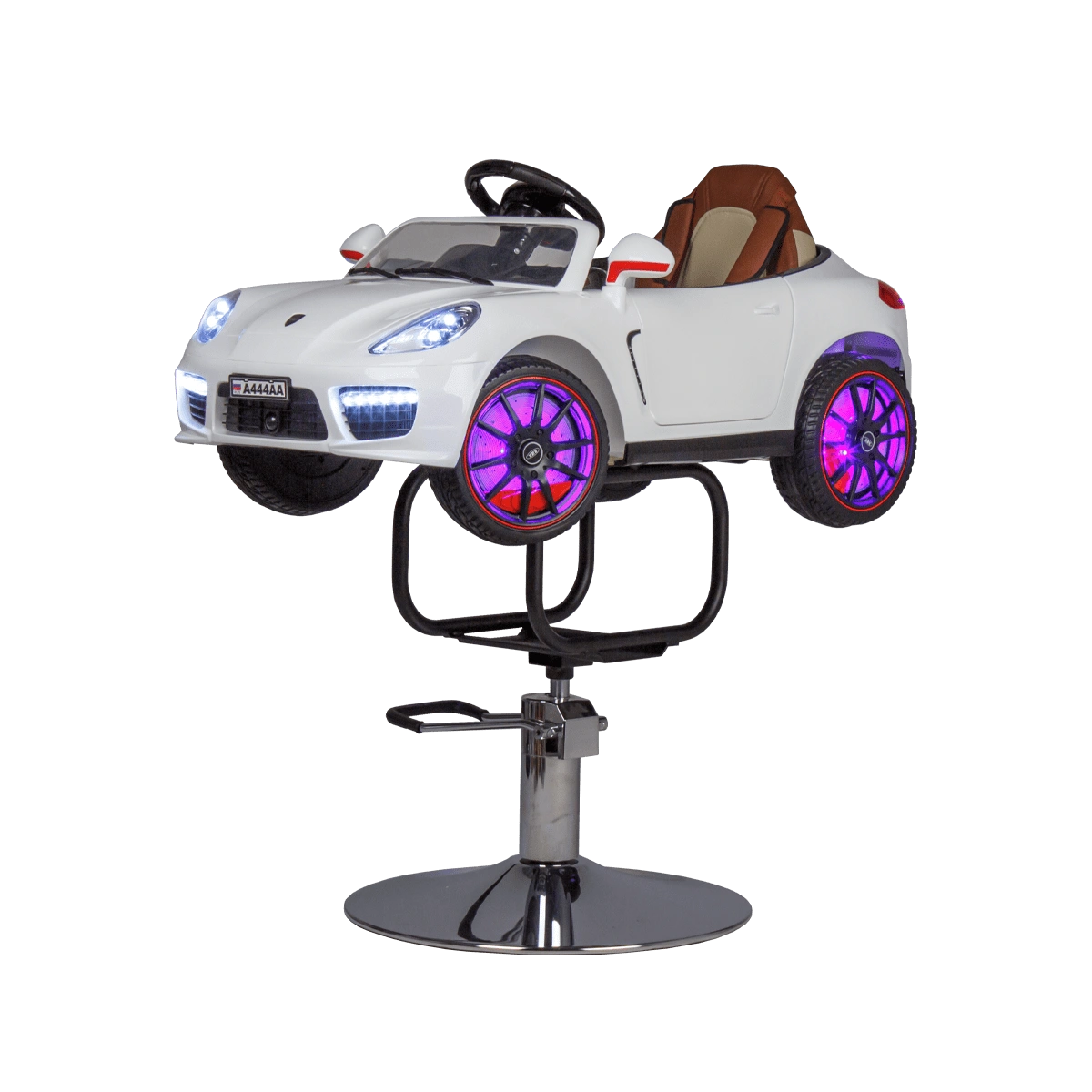 Стильное детское парикмахерское кресло машинка 01 – отличный выбор для комфорта маленьких посетителей бьюти салонов. Модель выполнена в виде белой гоночной машинки BMW с ярким привлекательным дизайном. В ней есть ключ зажигания, при повороте которого включаются фары и задние фонари. Для удобства малыша автомобиль оснащен комфортным сиденьем с высокой спинкой. Машинка установлена на металлический каркас и устойчивое хромированное основание в форме диска. Высота кресла регулируется с помощью надежного гидравлического подъемника. Данная модель подходит для детей от 3 до 6 лет.