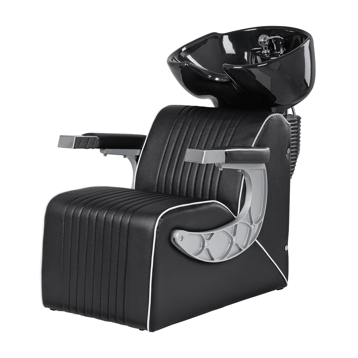 Комплектация мойки: раковина, сантехнические комплектующие, узел наклона раковины, каркас мойки, кресло, хромированные подлокотники с накладками под цвет кресла.