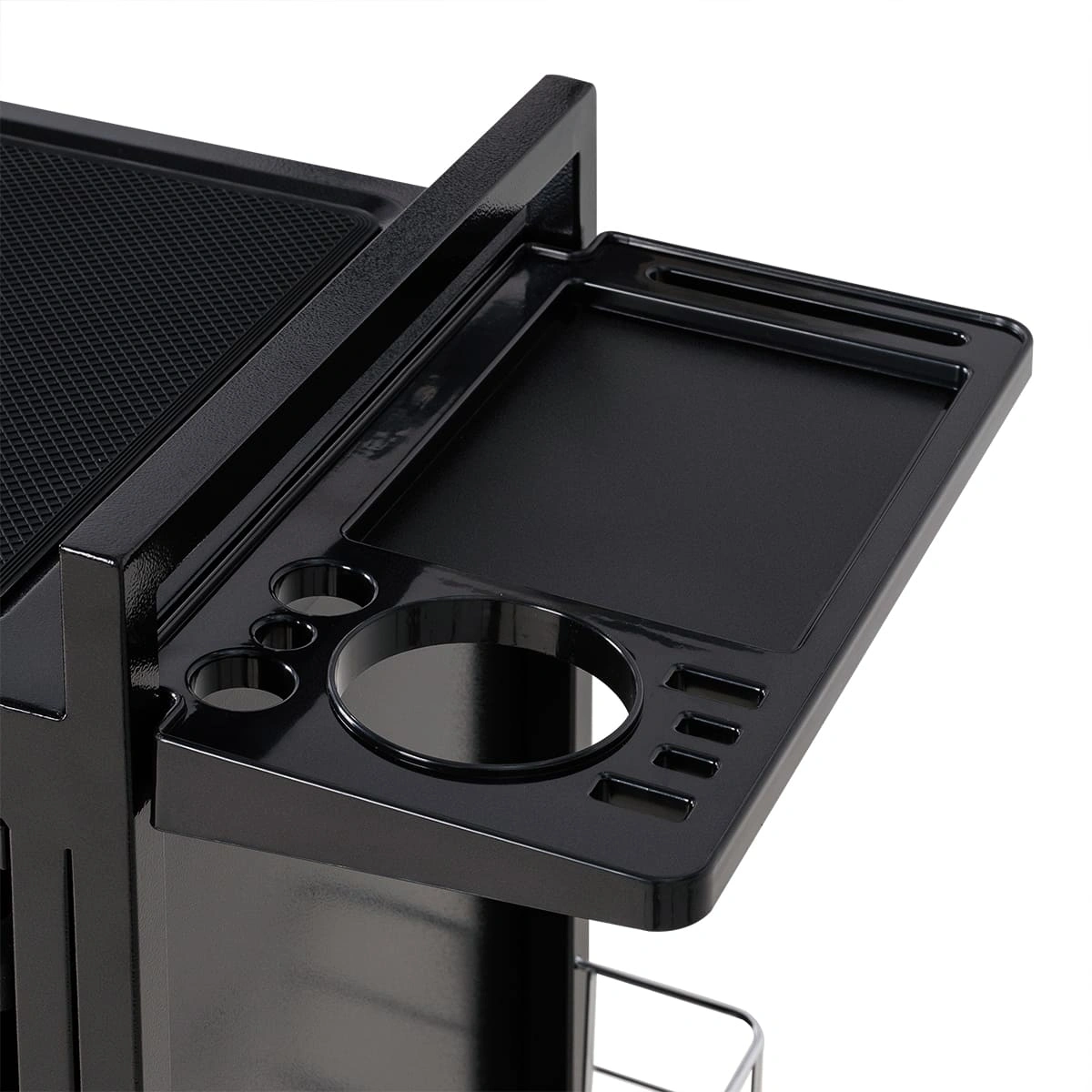 У парикмахерской тележки стильный прямоугольный дизайн с острыми углами. Верхняя многофункциональная полочка с ручками для перемещения, антискользящей ребристой поверхностью, держателем для фена и отверстиями для красок, брашингов и инструментов. Шесть выдвижных ящиков, закрывающихся на ключ, и боковые съемные сетки для хранения рабочих принадлежностей. Боковины и задняя стенка полностью закрывают внутреннее пространство для ящиков, что делает тележку практичной и удобной в работе.