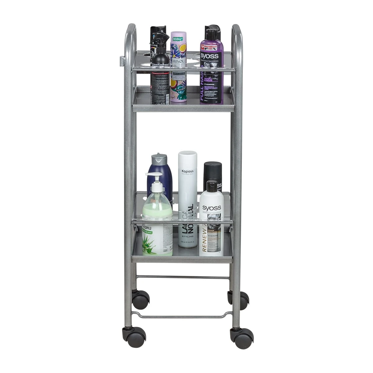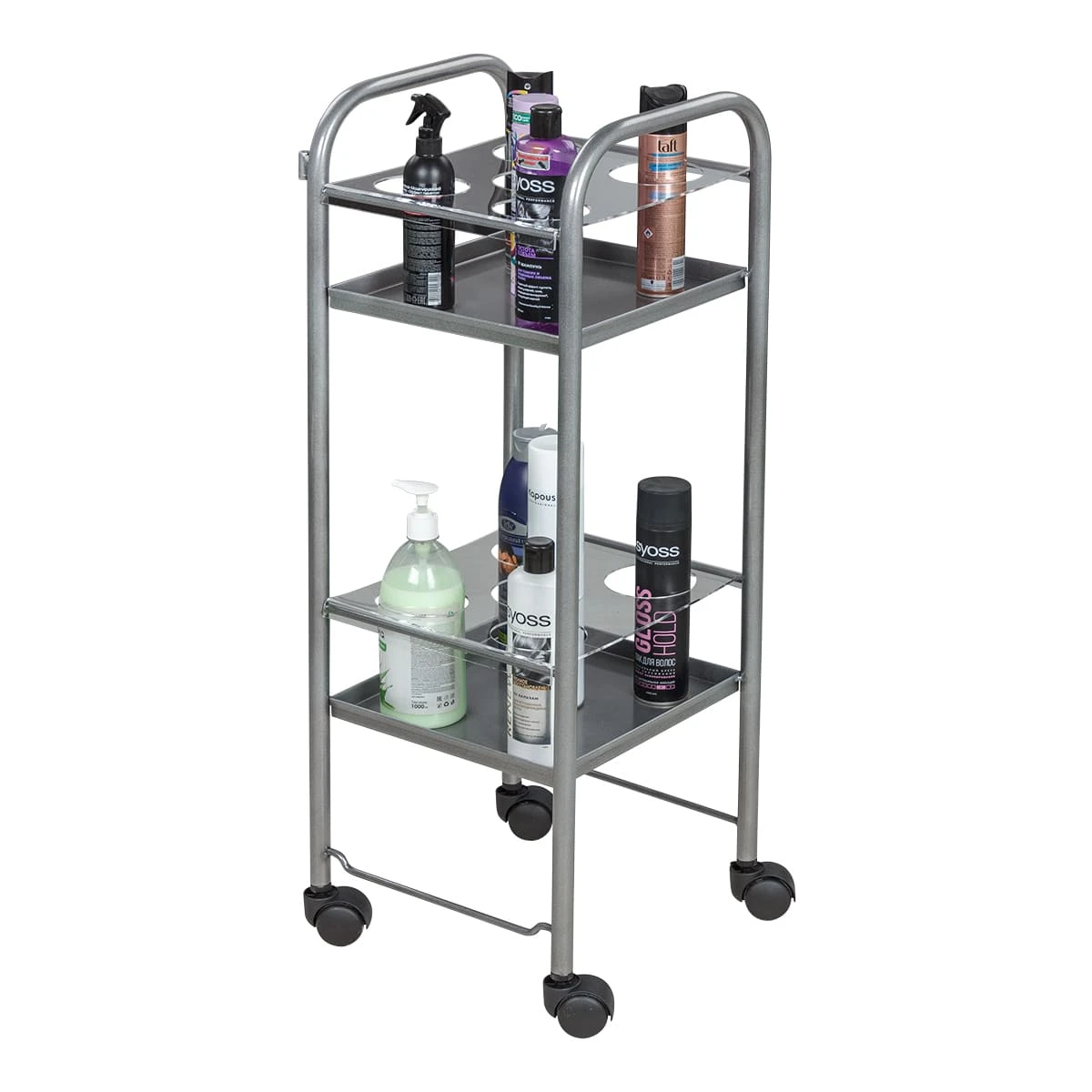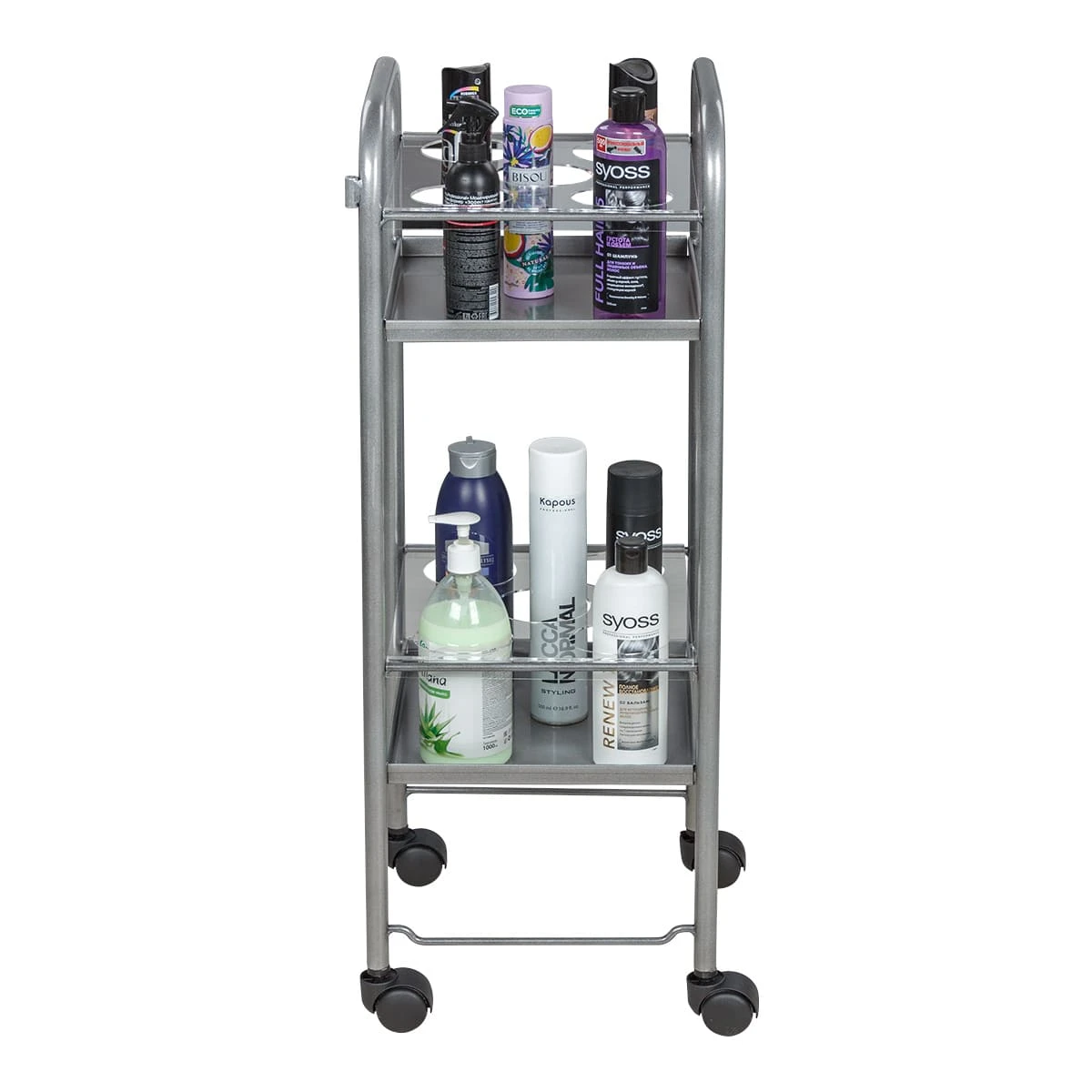 Парикмахерская тележка включает 2 полки, на которых предусмотрено по 5 отверстий для высоких флаконов. Верхние панели над полками съемные, поэтому данную модель можно использовать как обычную тележку. В конструкции нет боковых стенок, благодаря чему можно воспользоваться необходимыми средствами с любой стороны. Наличие вращающихся колес позволяет легко и плавно перемещать парикмахерское оборудование по рабочей зоне. Передвигая тележку, можно не переживать за напольное покрытие, так как колесики из пластика не повредят его.