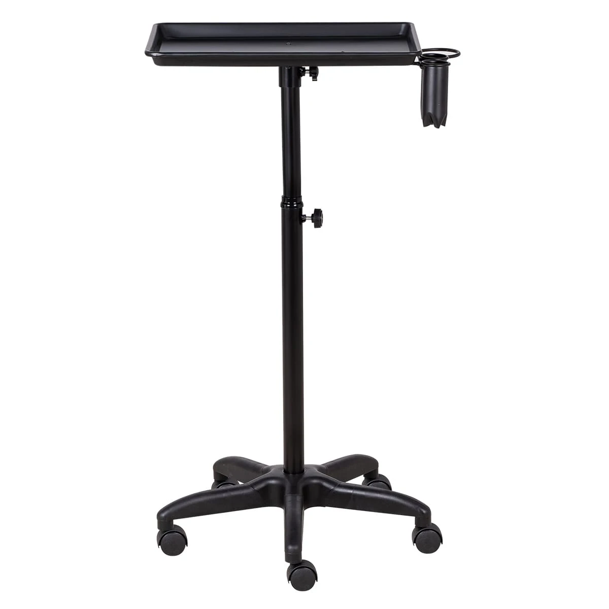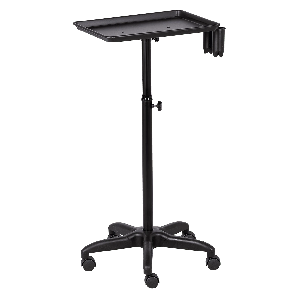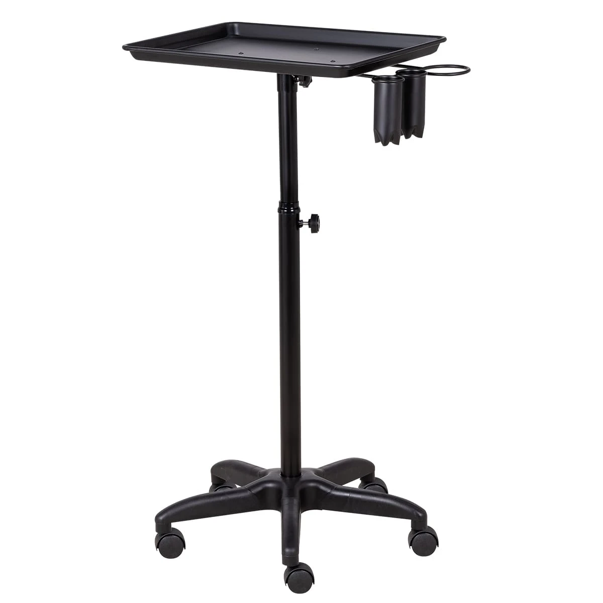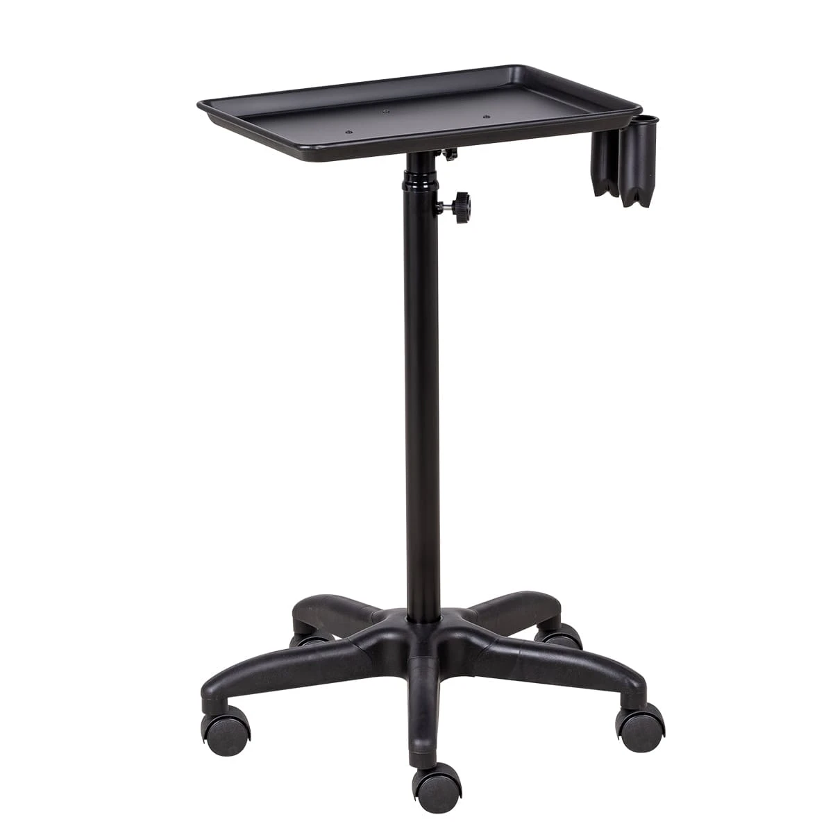 Каркас тележки изготовлен из прочного металла, благодаря пластиковому пятилучью на колесиках ее легко перемещать. Верхняя часть тележки – металлическая крышка на чёрной матовой трубе, регулирующейся по высоте. На крышке имеются держатель для фена и два держателя для ёмкостей и красок, что весьма удобно для работы.
