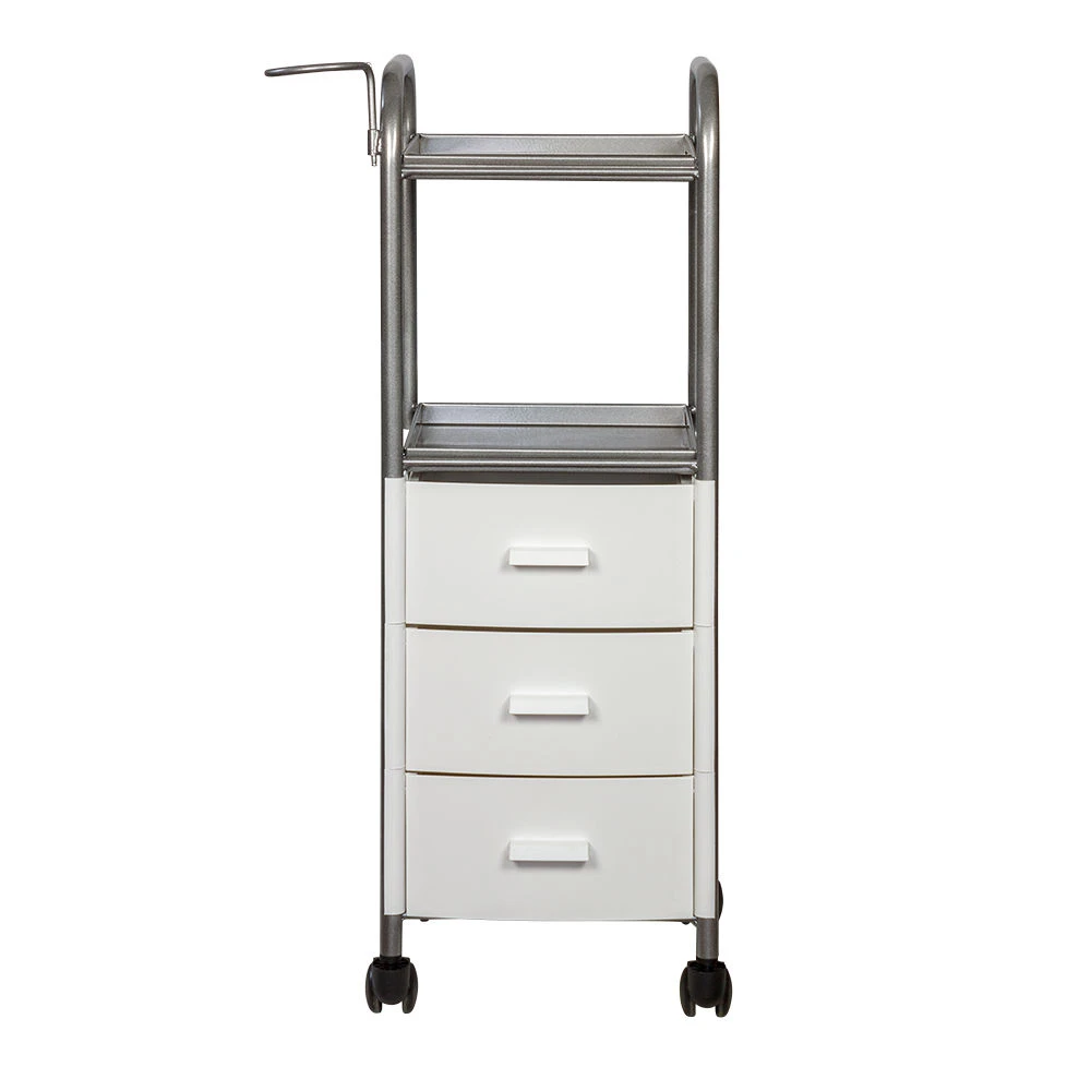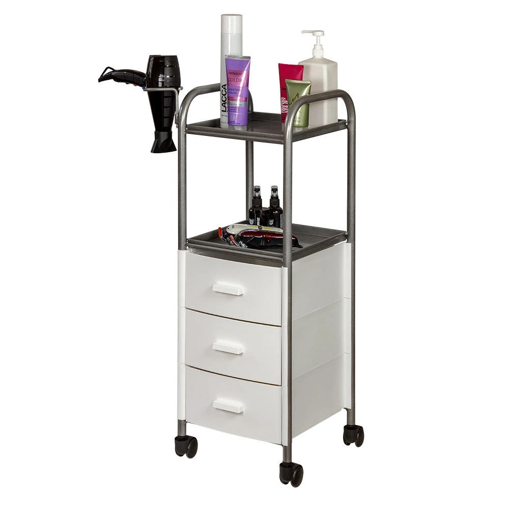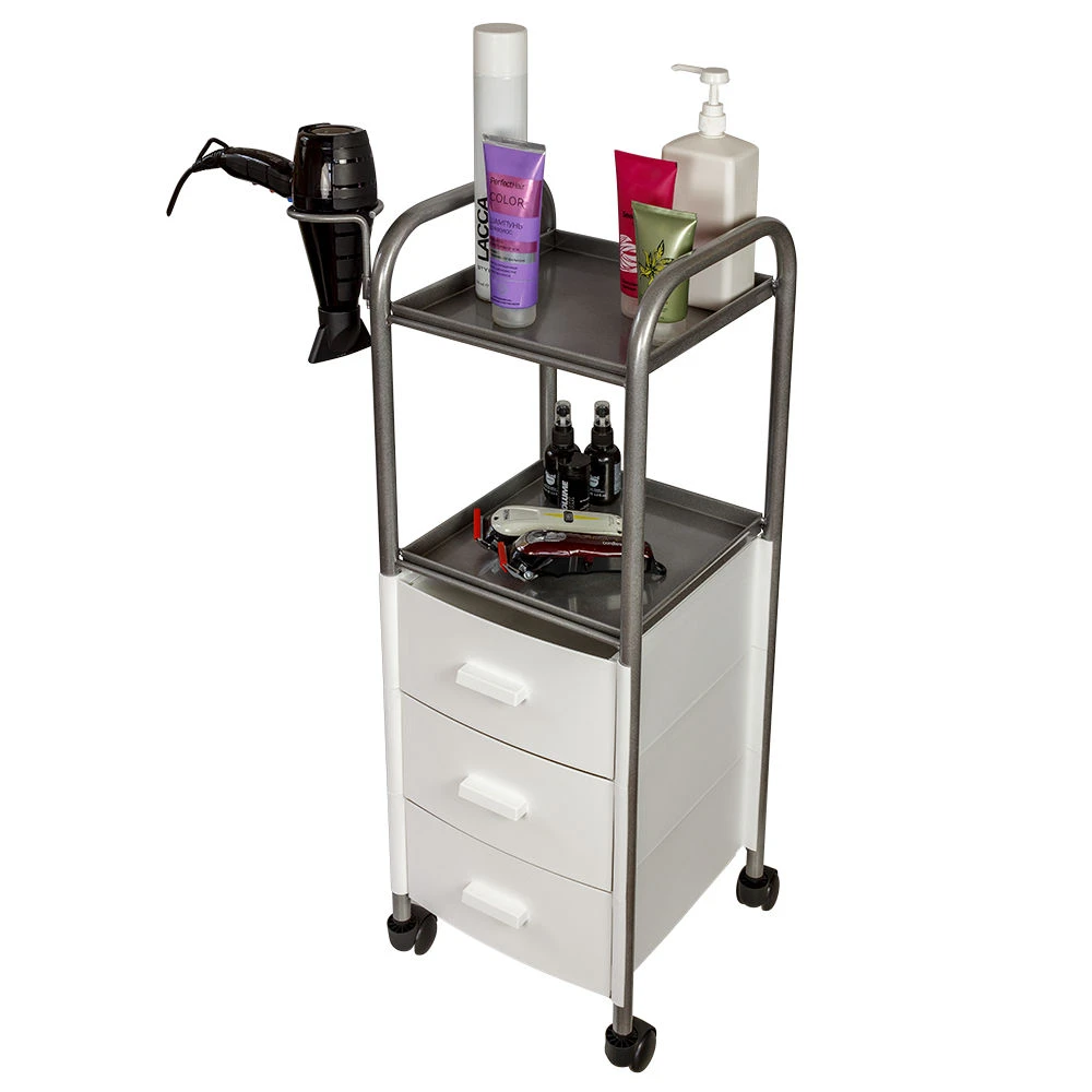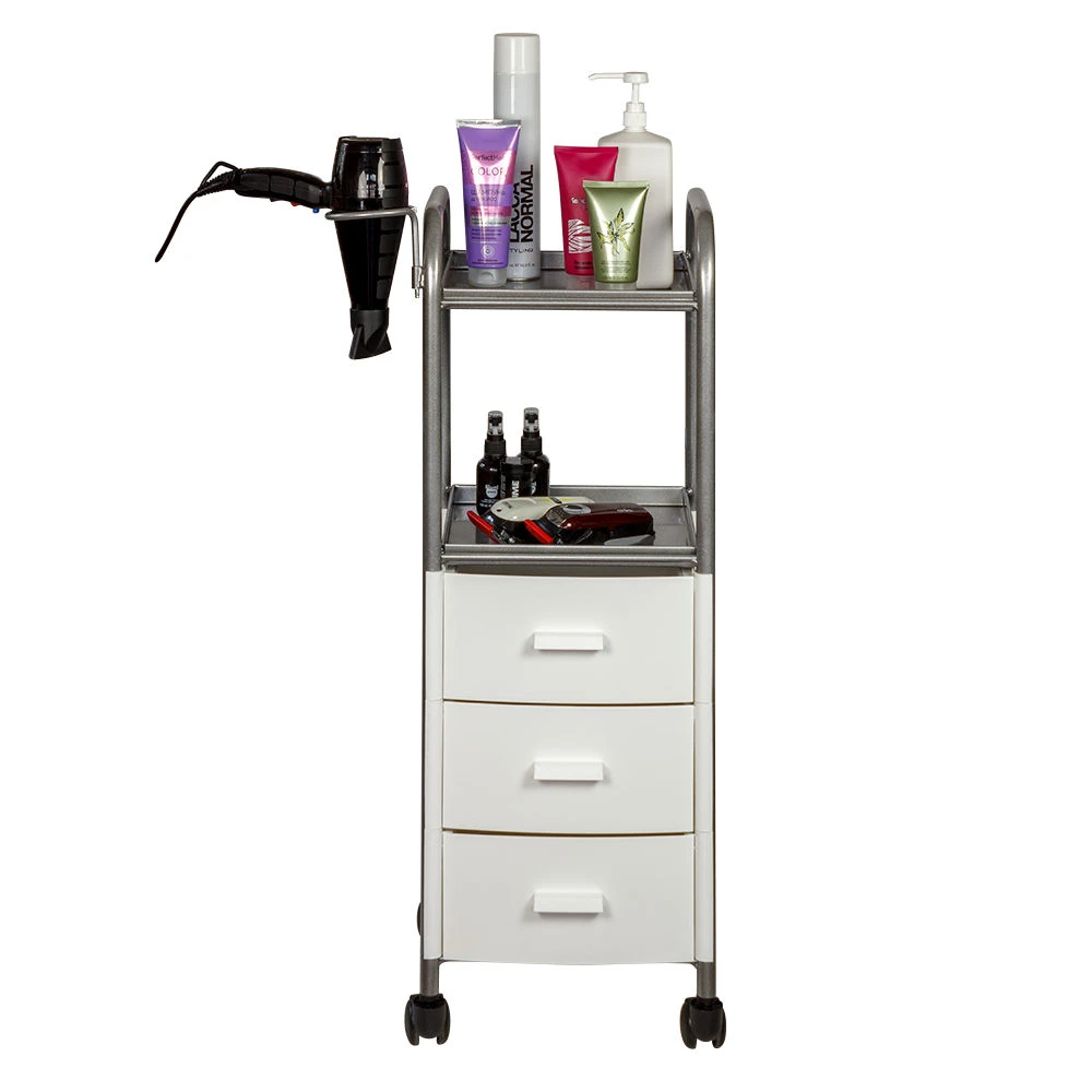 На двух полках достаточно места, что расставить инструменты, аксессуары и расходные материалы первой необходимости. В трех ящиках много места для хранения остальных приспособлений. Удачное дополнение парикмахерской тележки – удобный держатель для фена на боковине. Благодаря встроенным колесикам можно передвинуть тележку в нужное место.