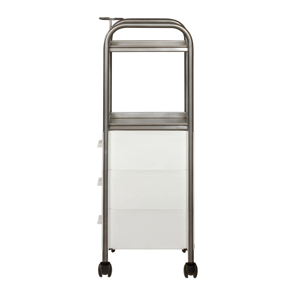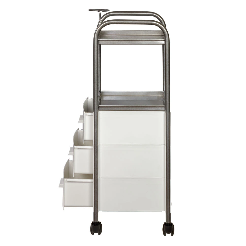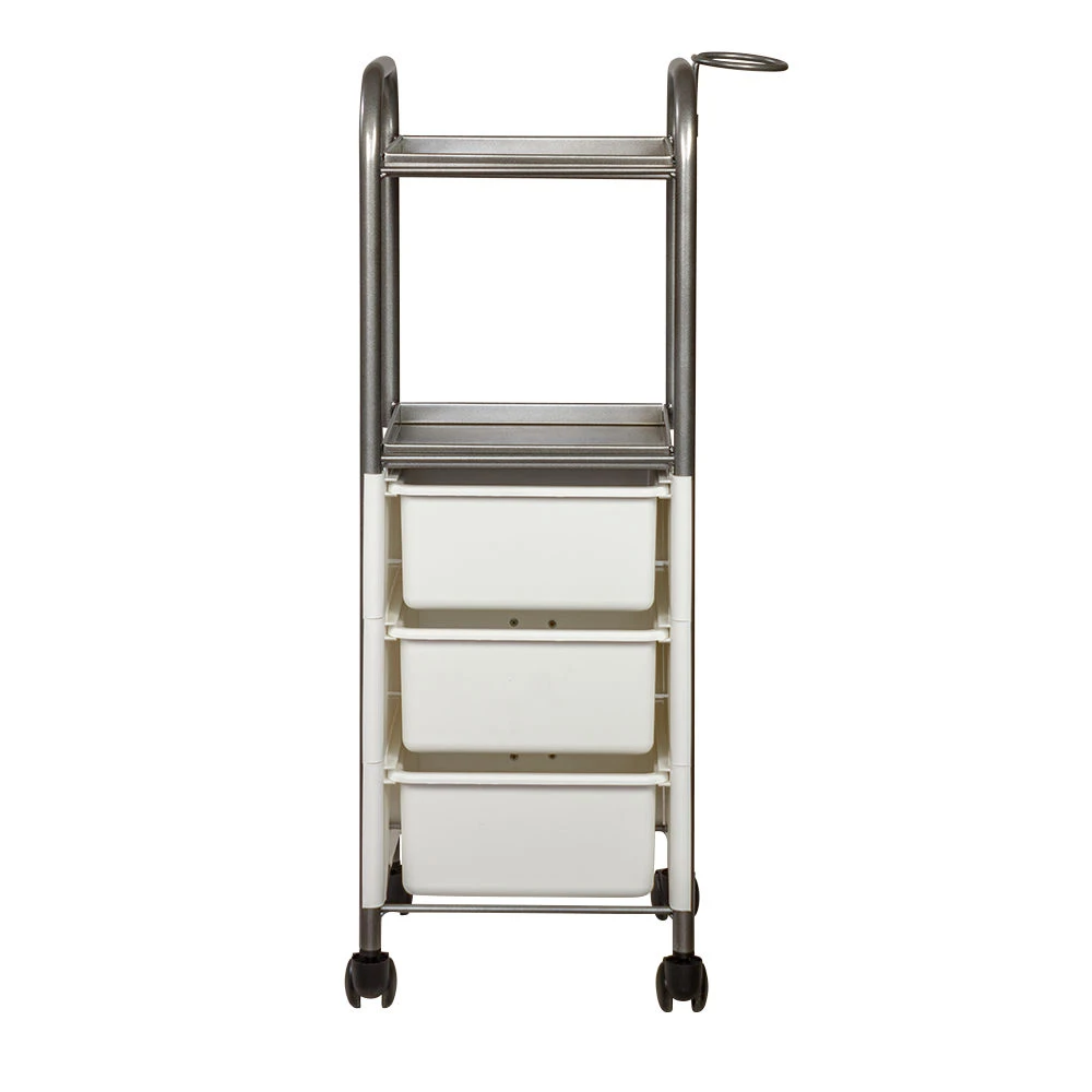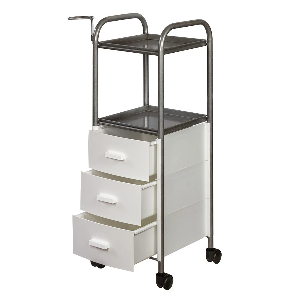 На двух полках достаточно места, что расставить инструменты, аксессуары и расходные материалы первой необходимости. В трех ящиках много места для хранения остальных приспособлений. Удачное дополнение парикмахерской тележки – удобный держатель для фена на боковине. Благодаря встроенным колесикам можно передвинуть тележку в нужное место.