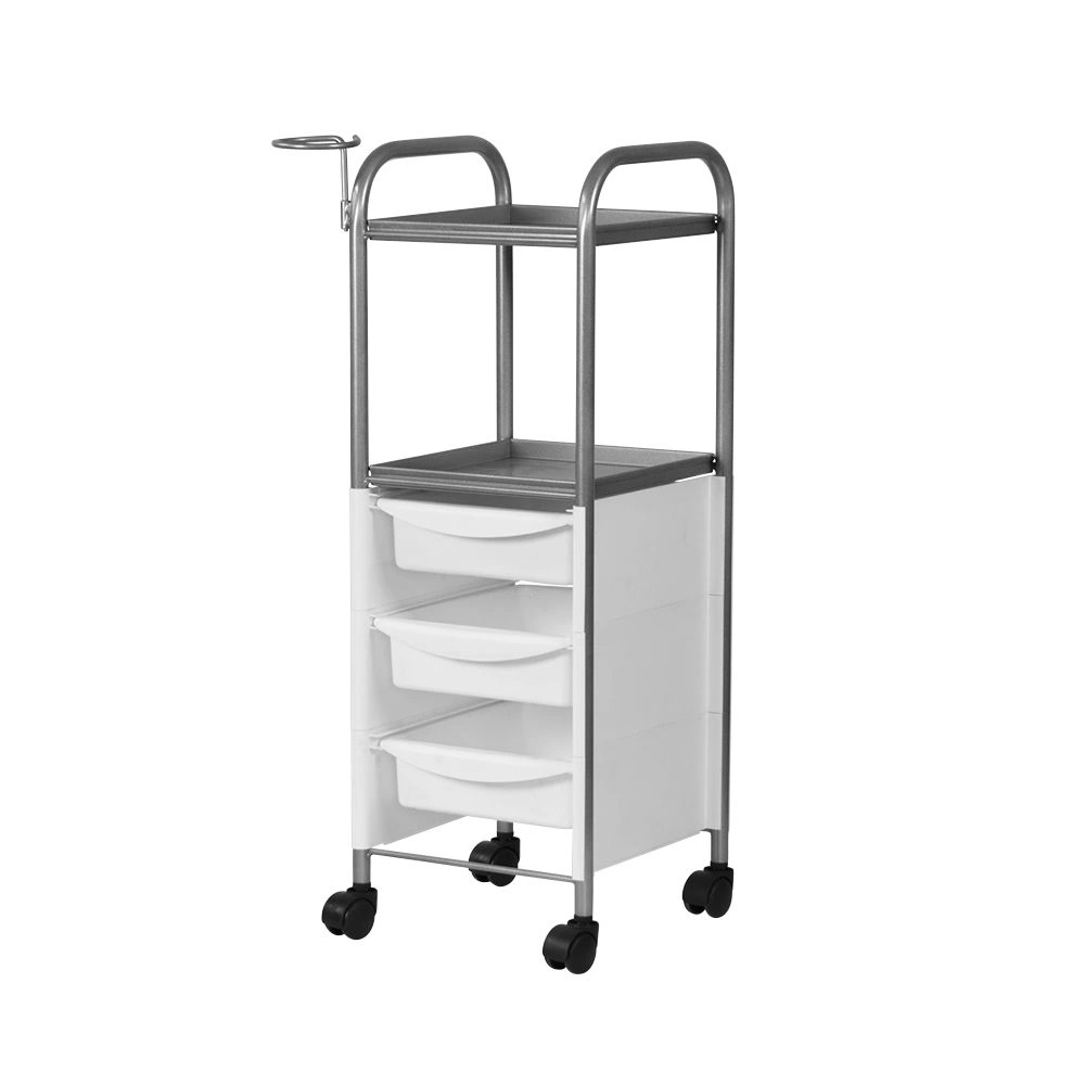 Комплектация: основа на маневренных колесиках, боковые панели, три ящичка, 2 полочки, держатель для фена.