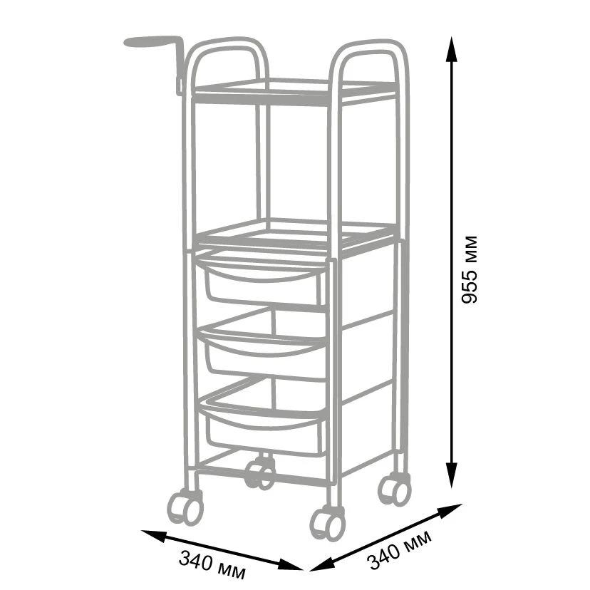 Каркас, полочки и фенодержатель изготовлены из прочного металла. Для защиты от коррозии и влаги на поверхность нанесен слой краски. Для создания боковин и ящиков использован качественный пластик устойчивый к влиянию очищающих средств. Пластиковые колеса предотвратят скольжение конструкции.