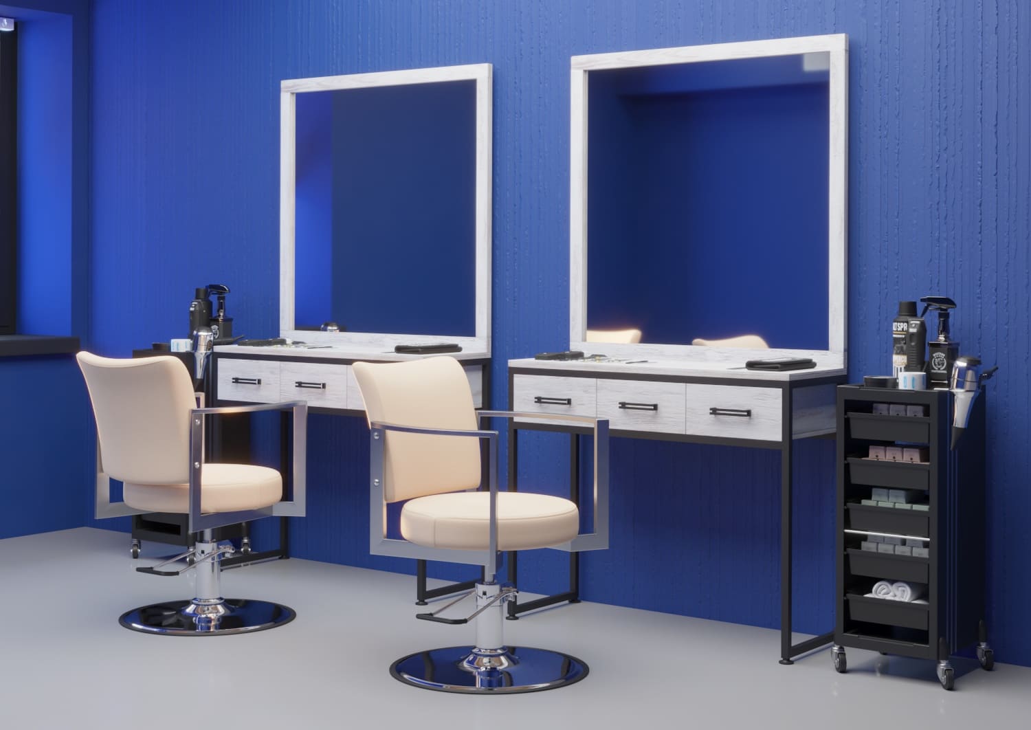 Парикмахерское рабочее место выполнено в современном стиле с гармоничным сочетанием светлого дерева и чёрного металла. Большое зеркало в широкой раме визуально расширяет пространство и позволяет мастеру контролировать процесс работы под любым углом.