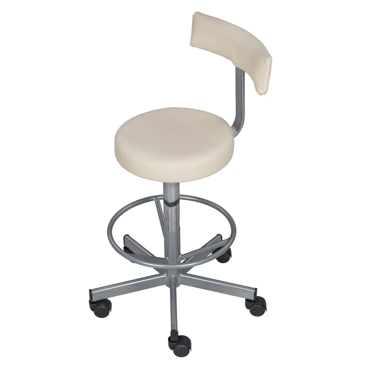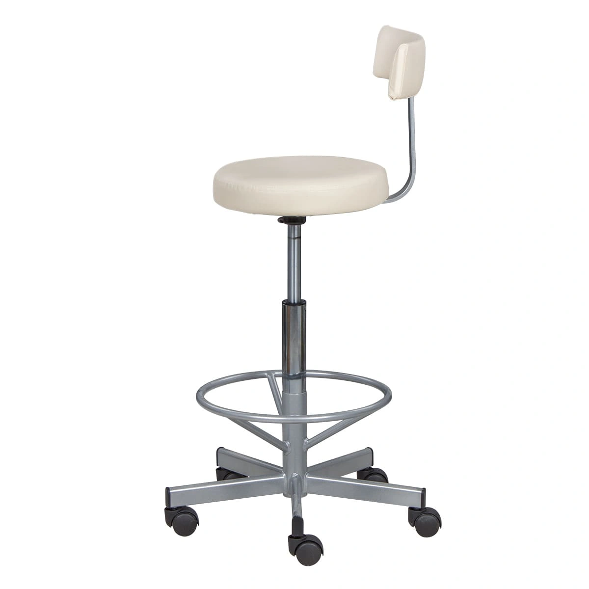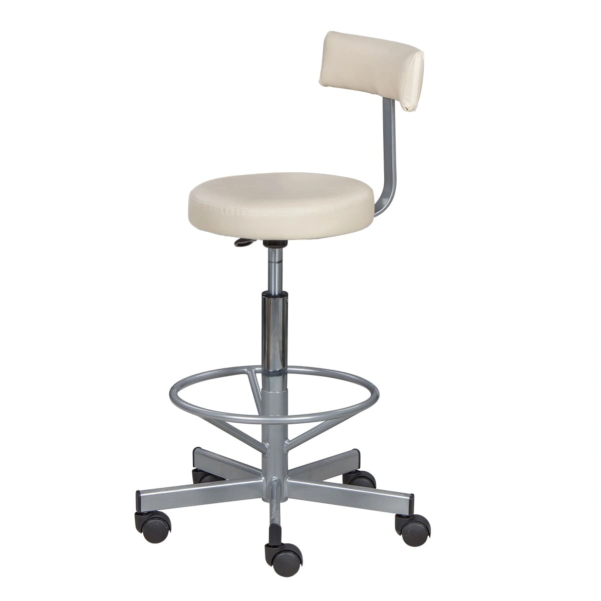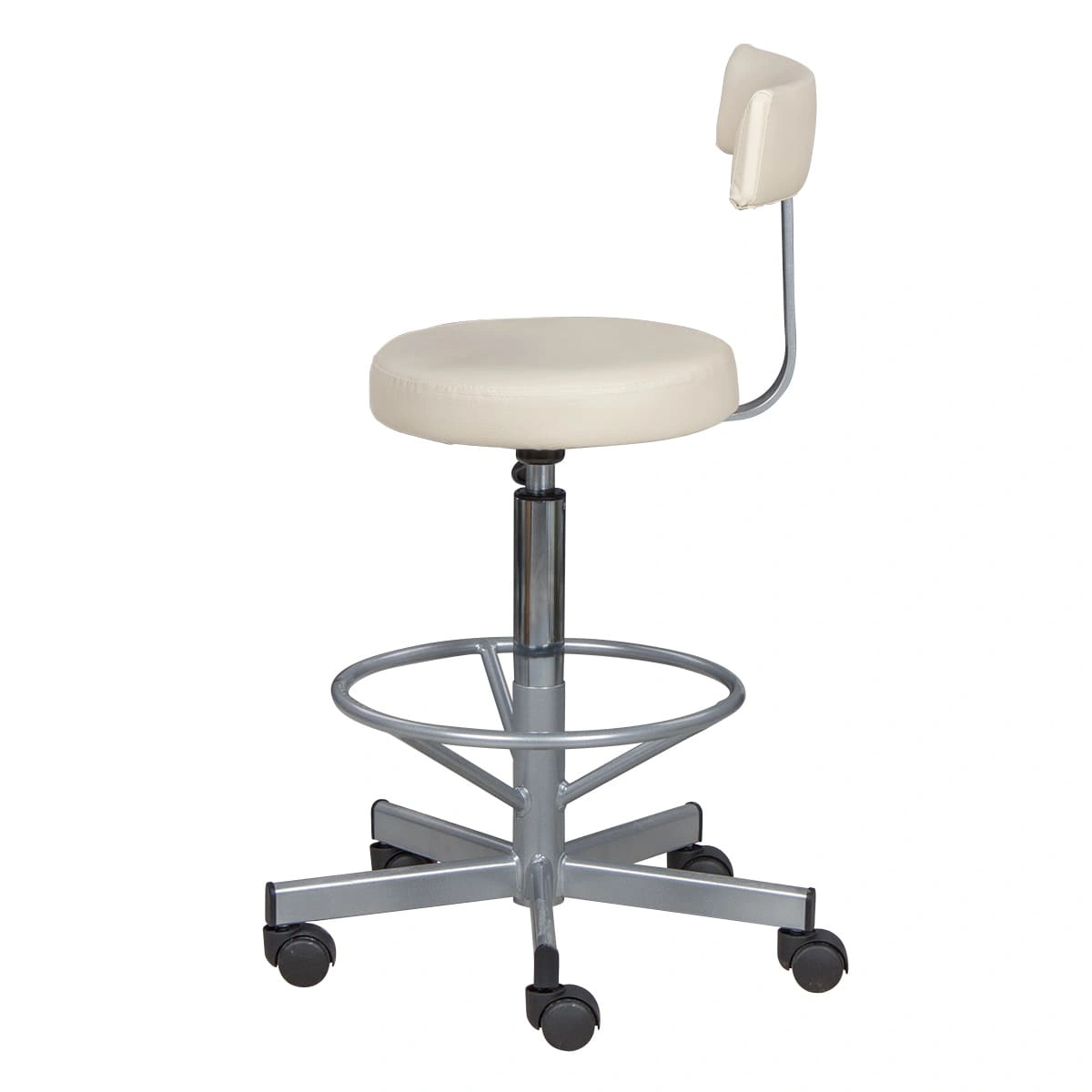 Сиденье со спинкой обеспечит мастеру удобства, необходимые для комфортной работы. Удобная опора предназначена для комфорта ног специалиста. Надежный пневматический механизм позволяет подобрать желаемую высоту сиденья для разных процедур. Маневренные колесики отвечают за легкое и бесшумное перемещение парикмахерского оборудования.