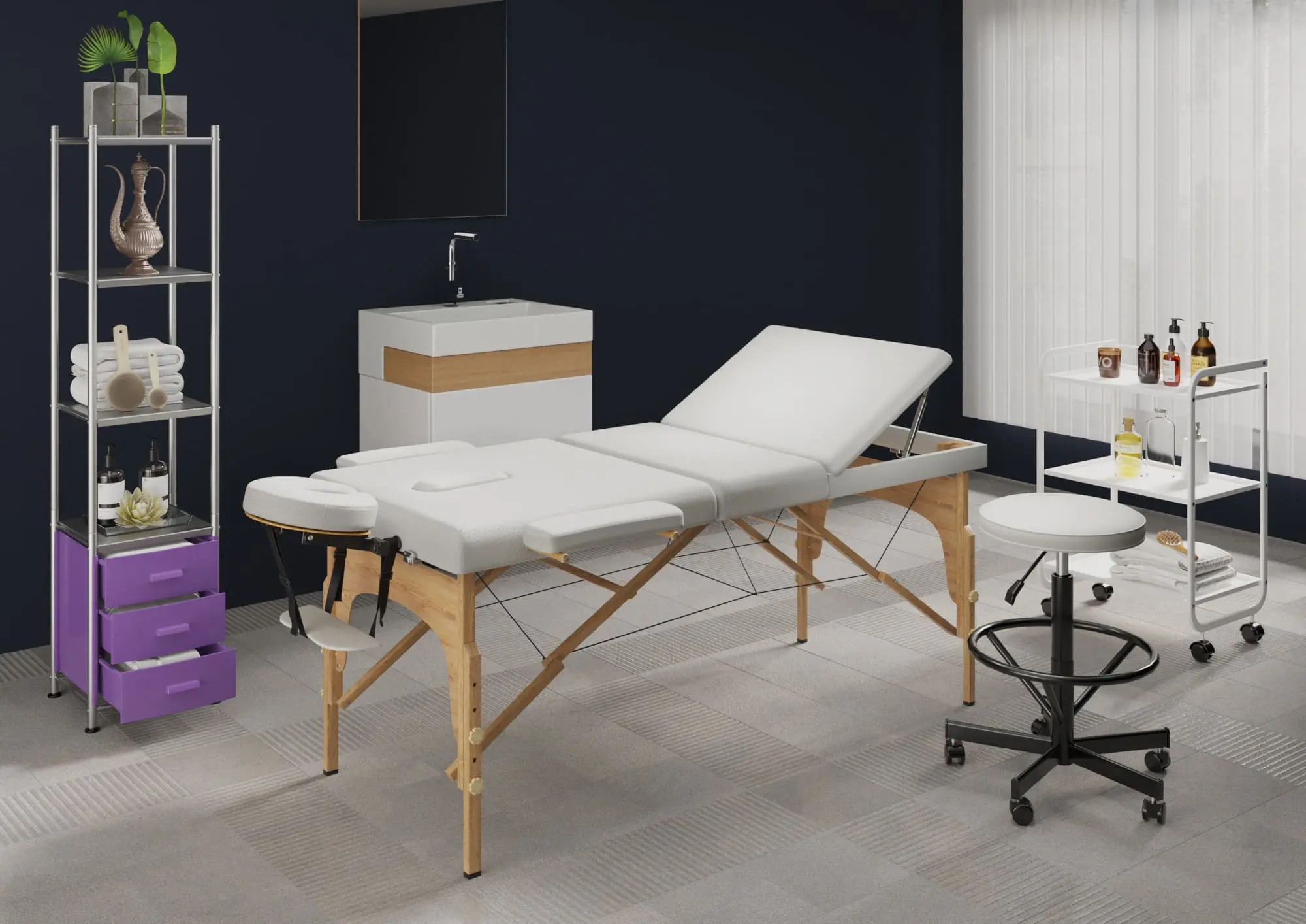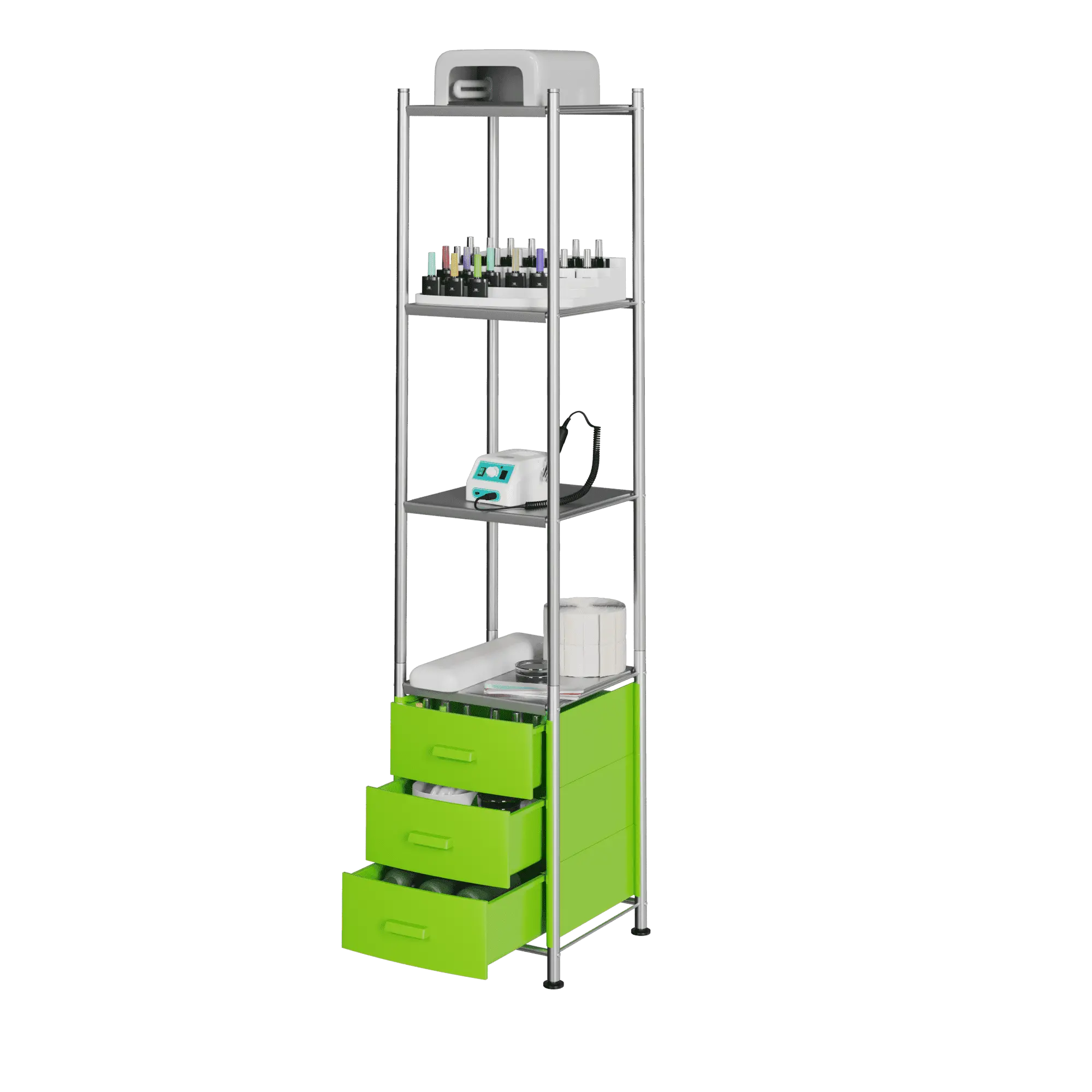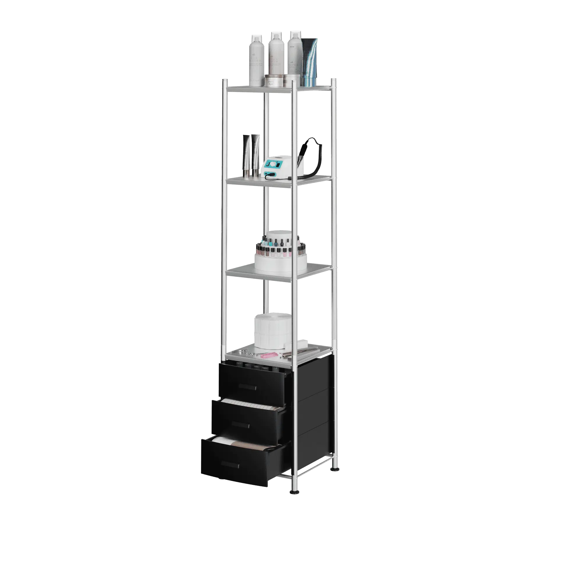 Стеллаж Lino-3 – компактное и одновременно вместительное место хранения косметических средств и инструментов, необходимых в работе. Открытые полки позволяют удобно расположить оборудование, которое должно быть под рукой. Закрытые выдвижные ящики служат местом хранения мелочей, аппаратов и сопутствующих предметов. Стеллаж позволяет поддерживать порядок на рабочем месте, при этом не занимает много места, помогая эффективно организовать пространство.