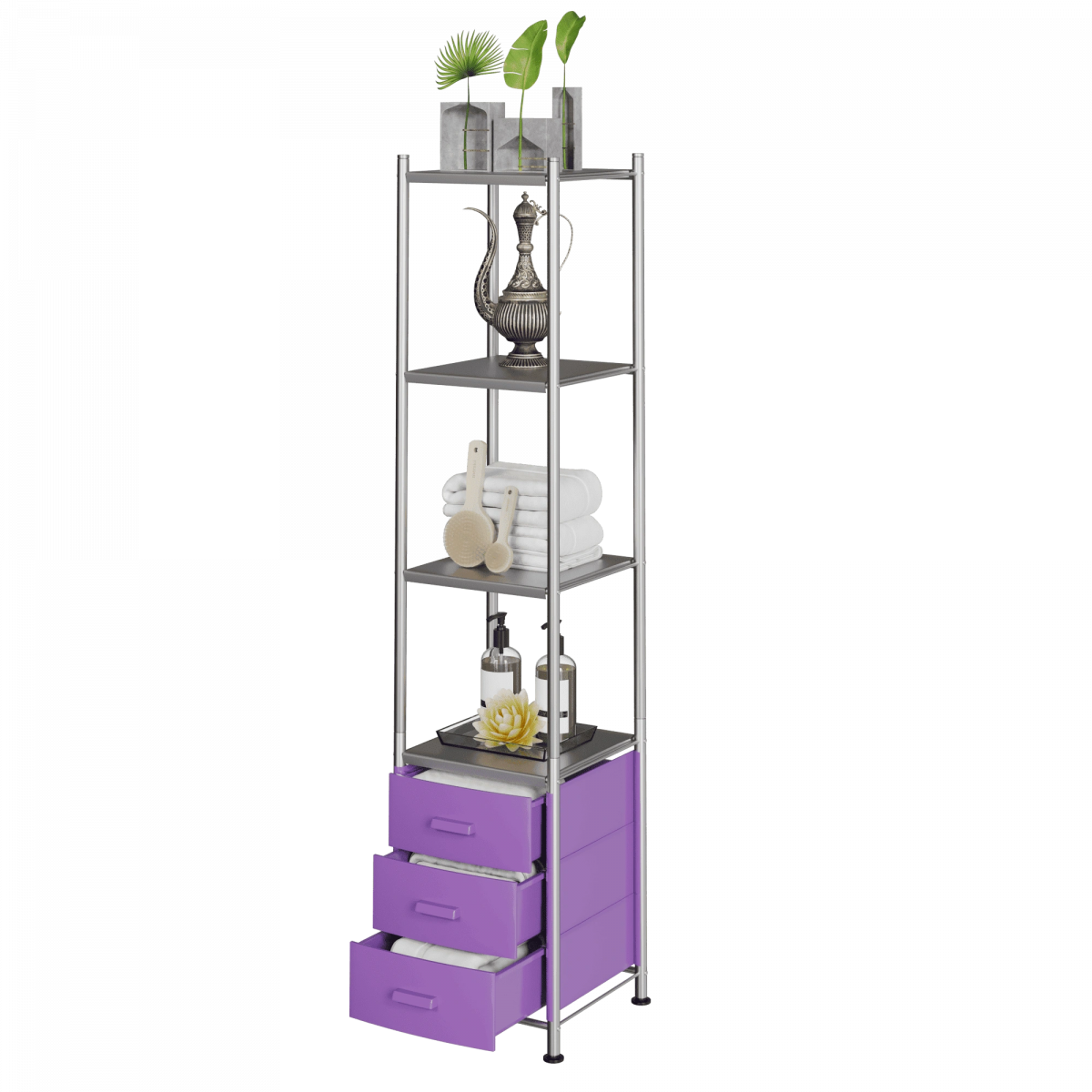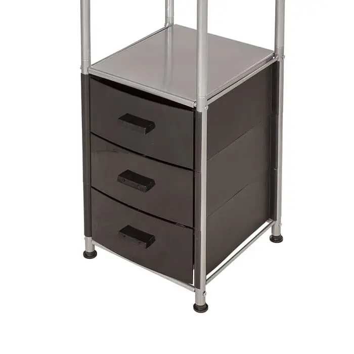 Комплектация: металлический каркас, 3 ящика, 4 открытые полки.