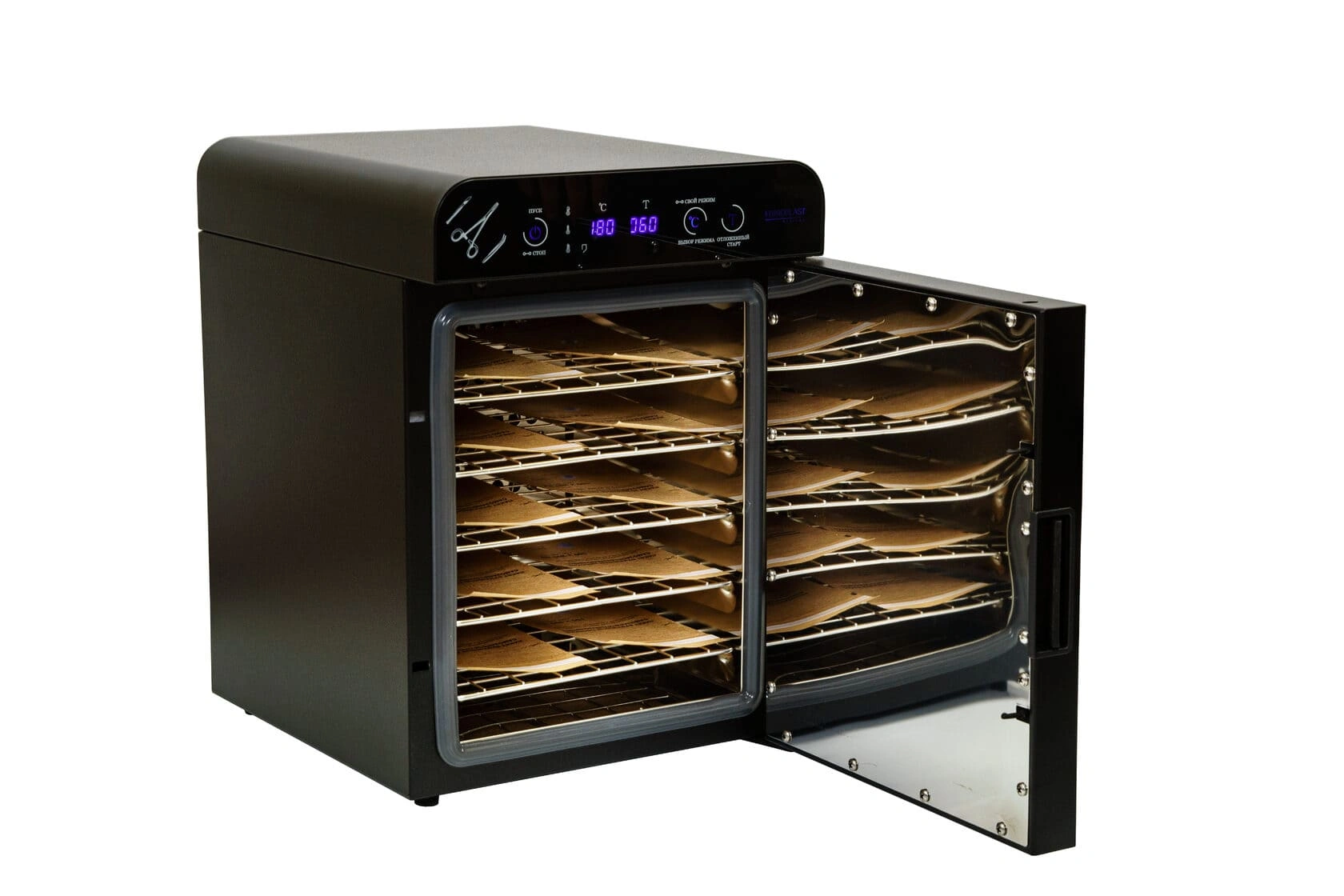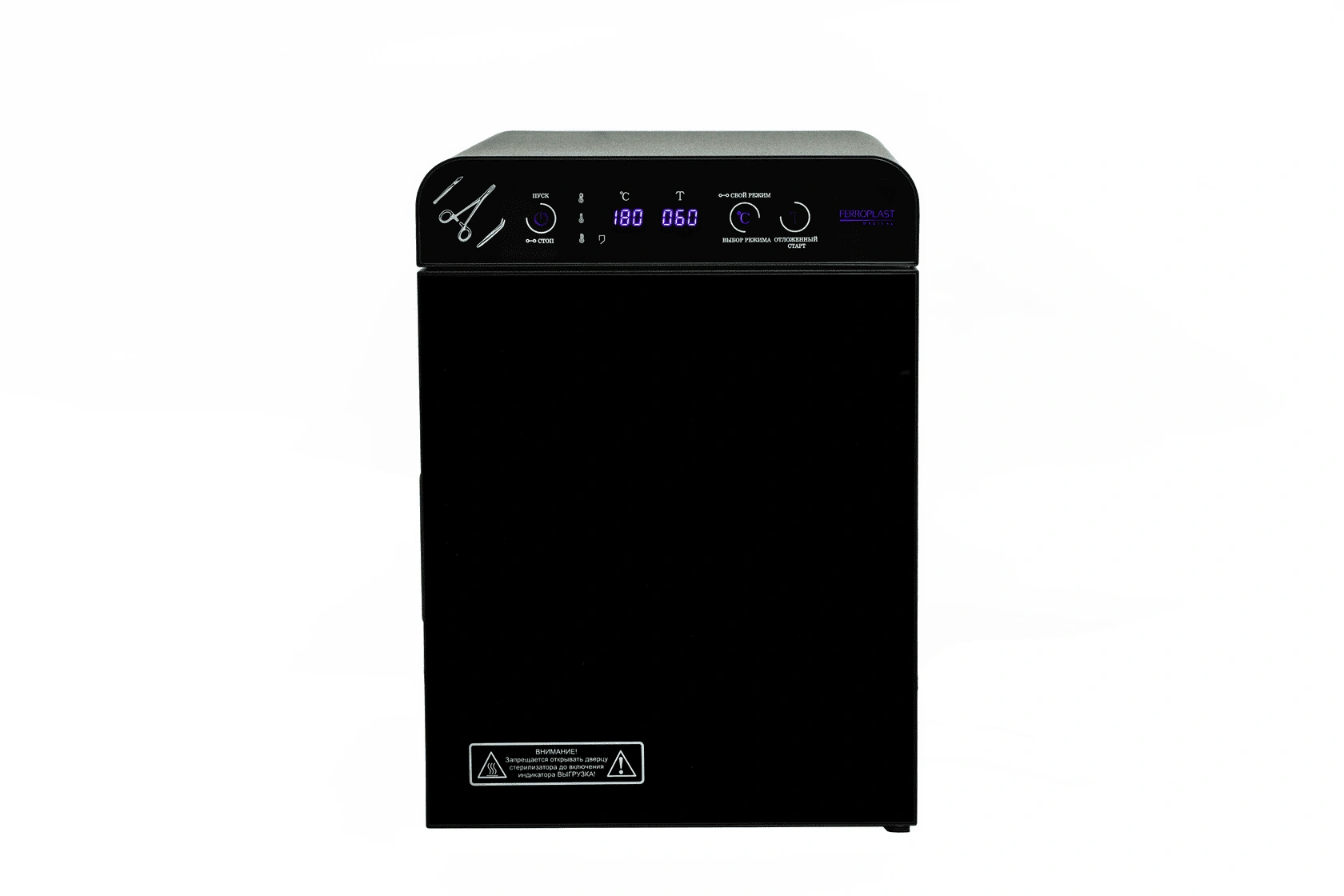Стерилизатор "Ферропласт" при загруженной стерилизационной камере должен обеспечивать автоматическую поддержку температурных режимов в диапазоне от +85°С до +180°С и времени стерилизационной и дезинфекционной выдержки, а также пользовательского программируемого режима +50°С до +200°С, интервалом от 1 до 999 минут.