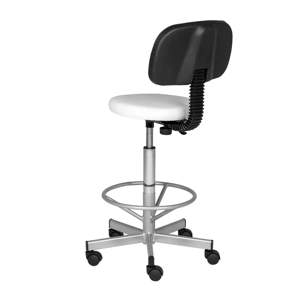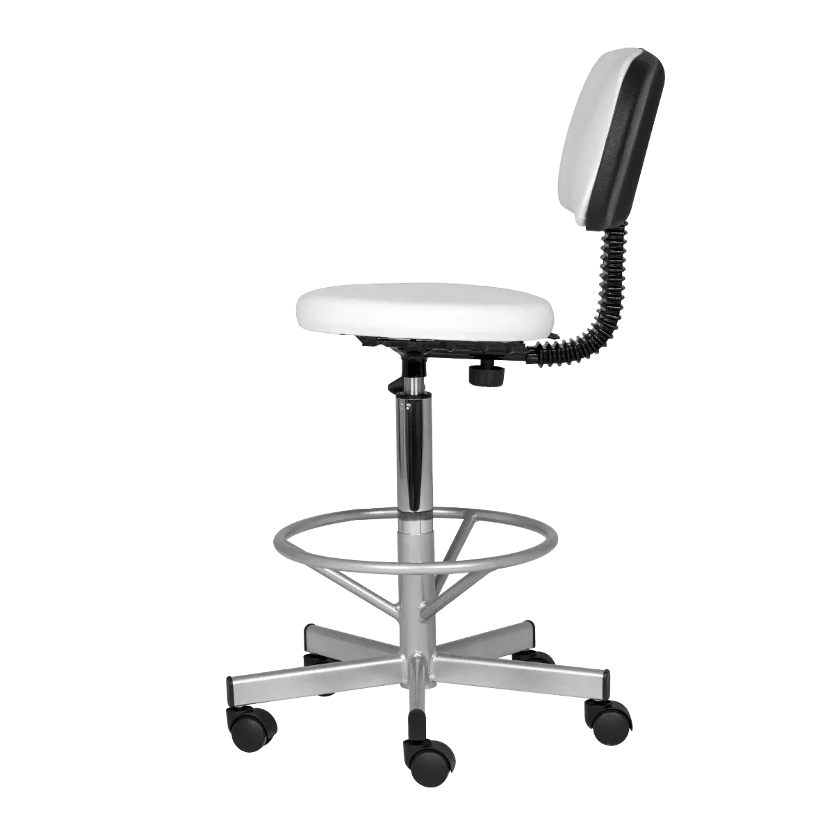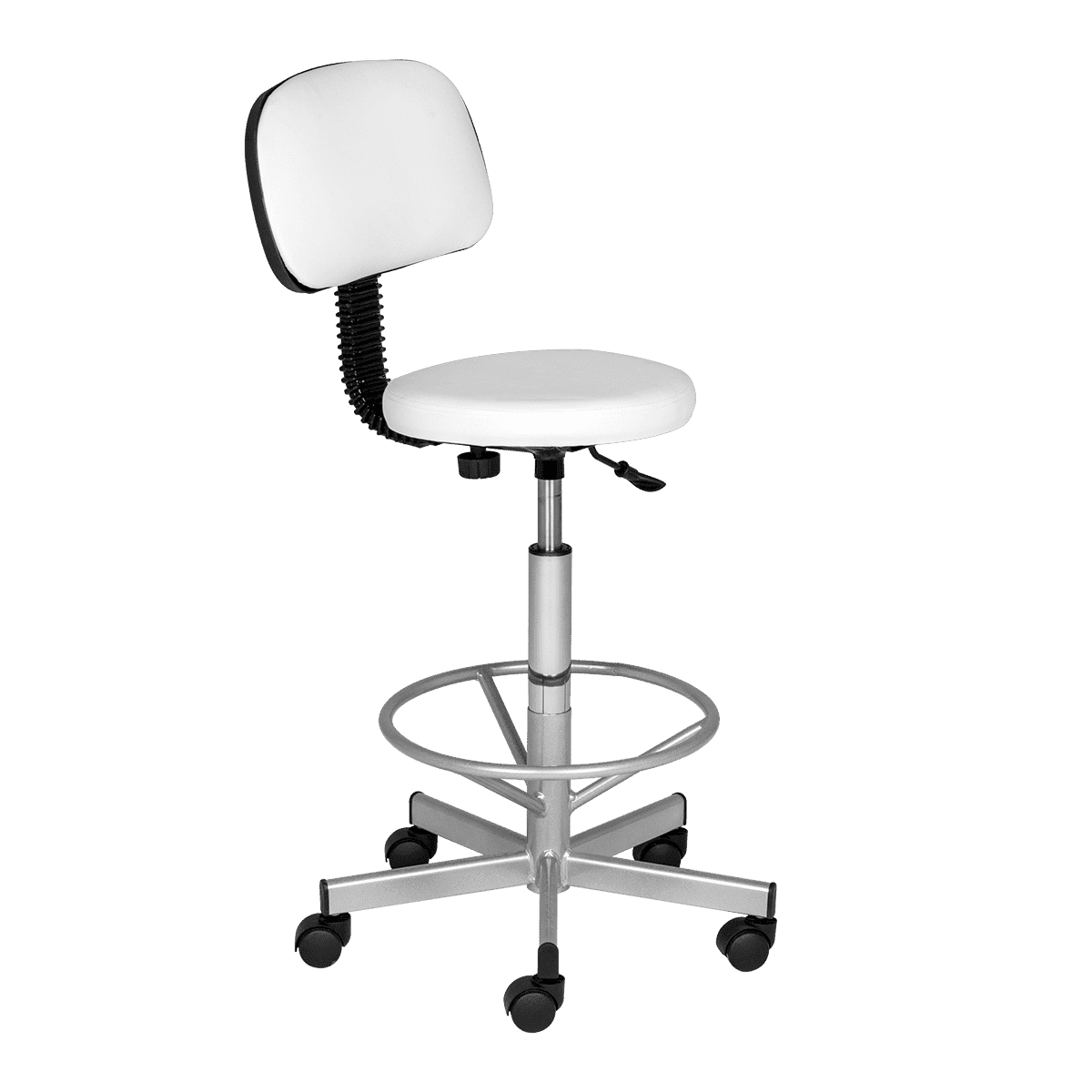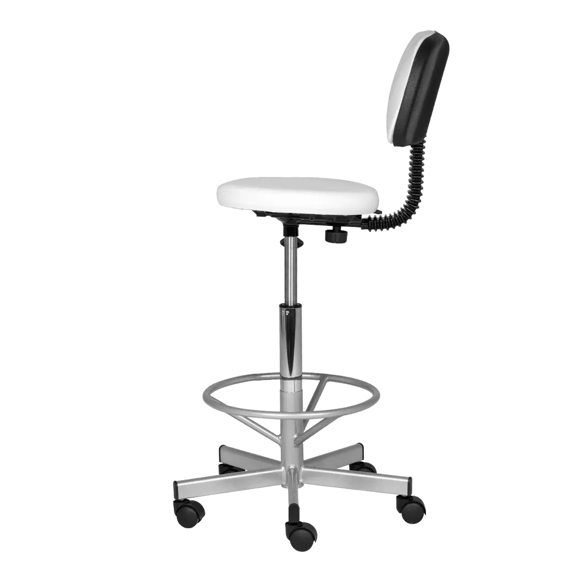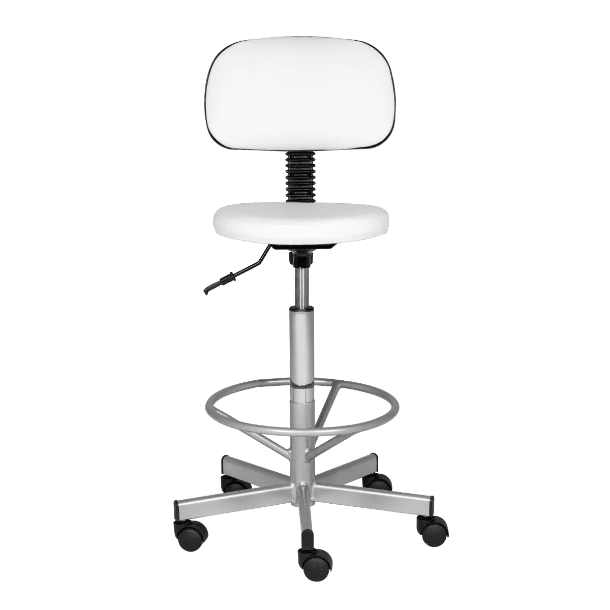Каркас и опора для ног выполнены из прочного хромированного металла, который выдерживает большие нагрузки. Настроить высоту сиденья можно с помощью надежного подъемного механизма – пневматики. Благодаря опоре и спинки усталость мастера при выполнении процедуры уменьшается, а уровень комфорта, напротив, увеличивается в разы, что положительно сказывается на скорости и качестве проводимых косметологических манипуляций.
