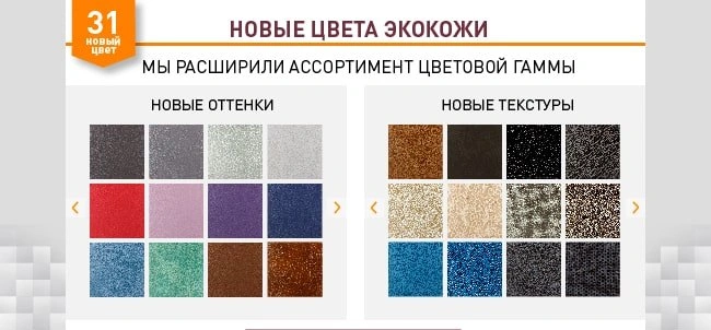 2) В каждой категории экокожи обновился и дополнился ассортимент! Теперь в нашем постоянном ассортименте более 100 вариантов экокожи на выбор.