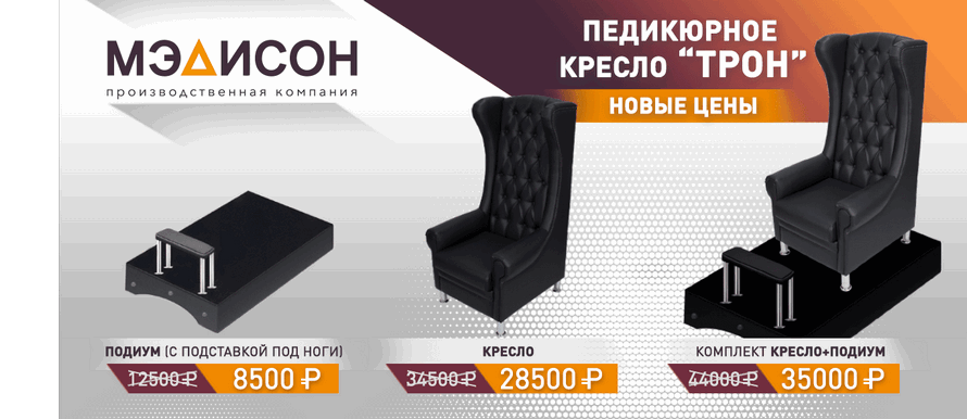 Экономьте вместе с компанией МЭДИСОН! Специально для наших клиентов выгодное предложение – педикюрное кресло Трон по очень привлекательной цене! Снижение цен предлагаем на модели: